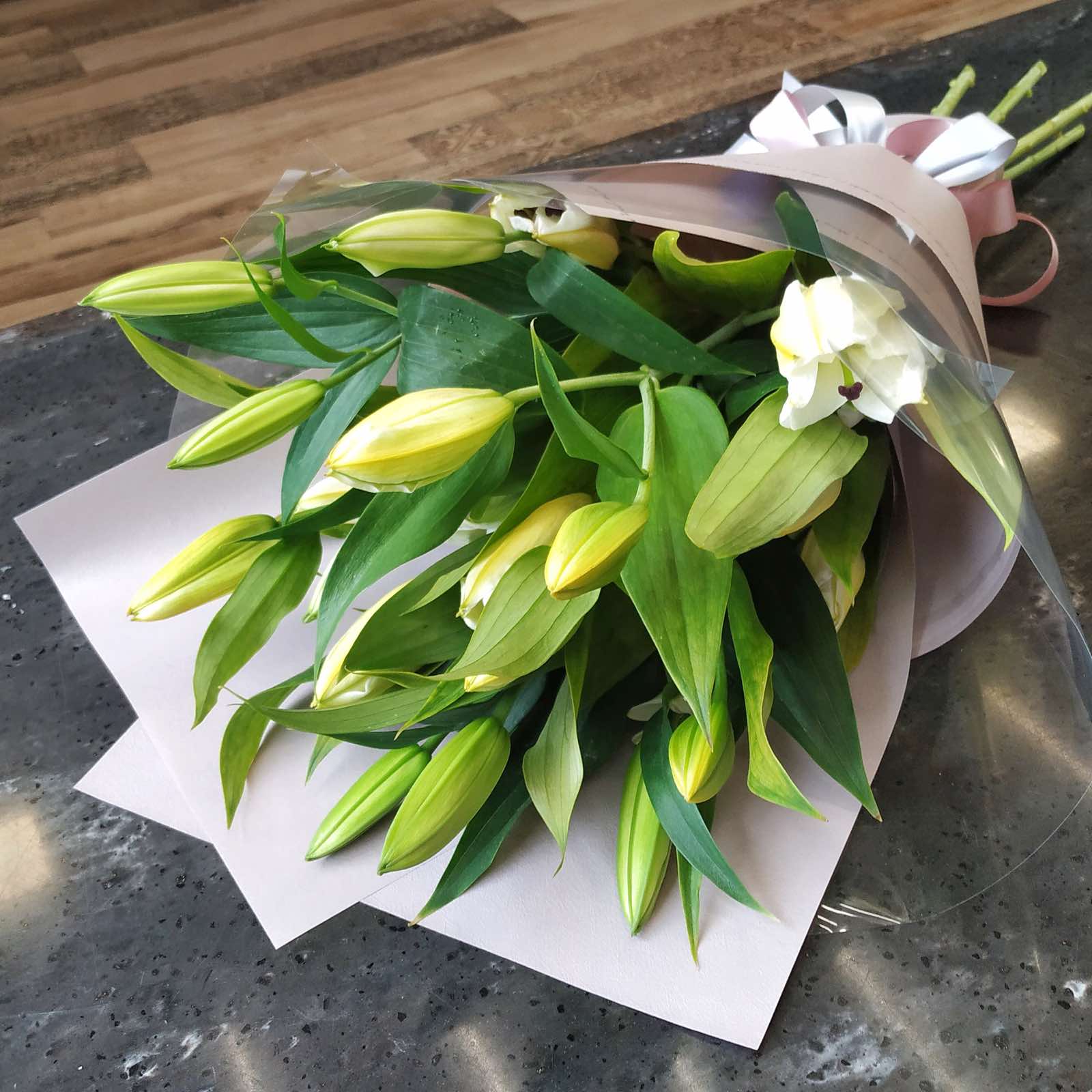 Букет из 5 веточек лилии в оформлении.