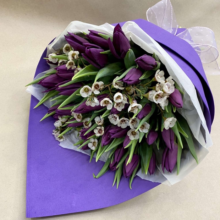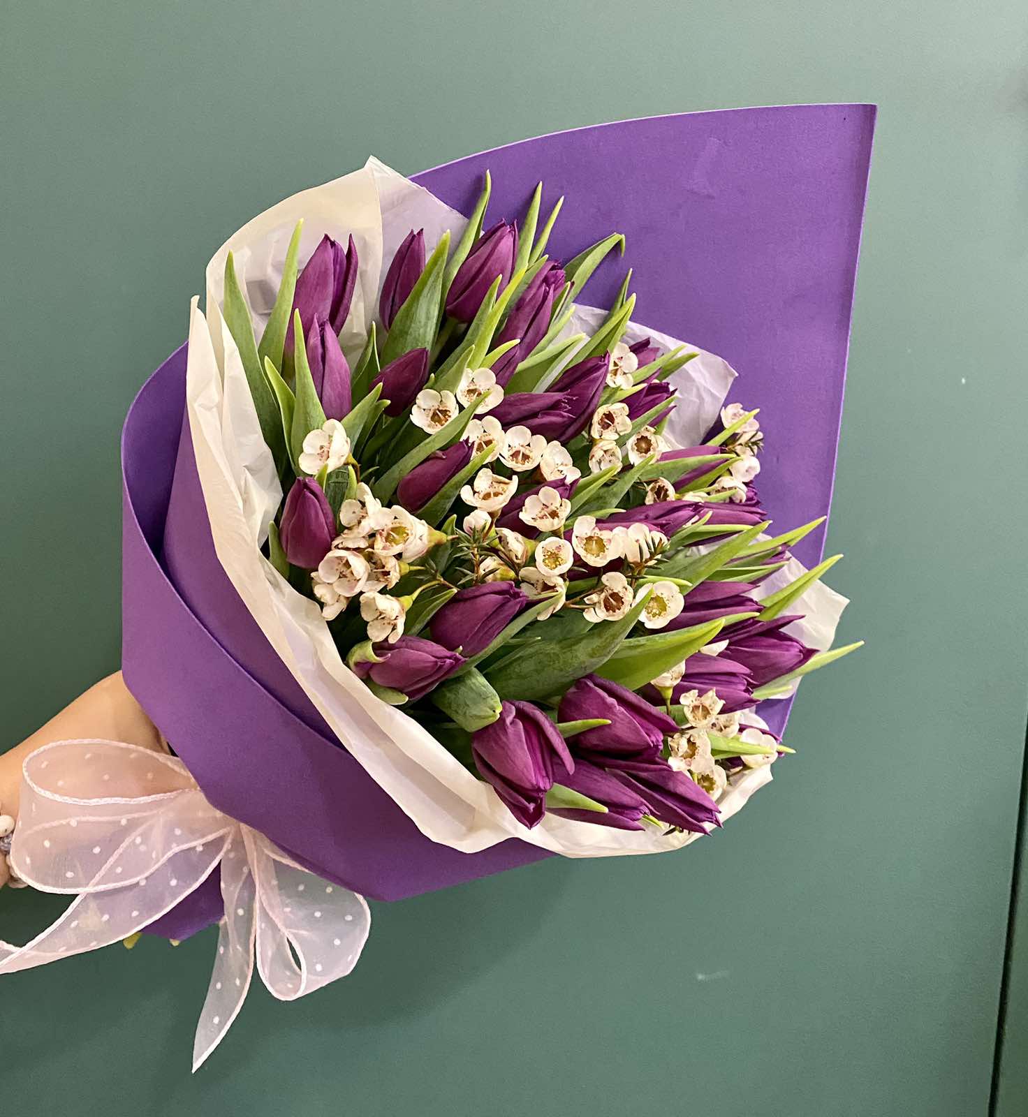 Акция! Букет из 31 тюльпана и хамелациума Взрывной Микс