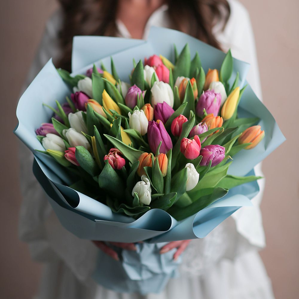 Букет из 51 разноцветного тюльпана. Настоящий весенний букет.
