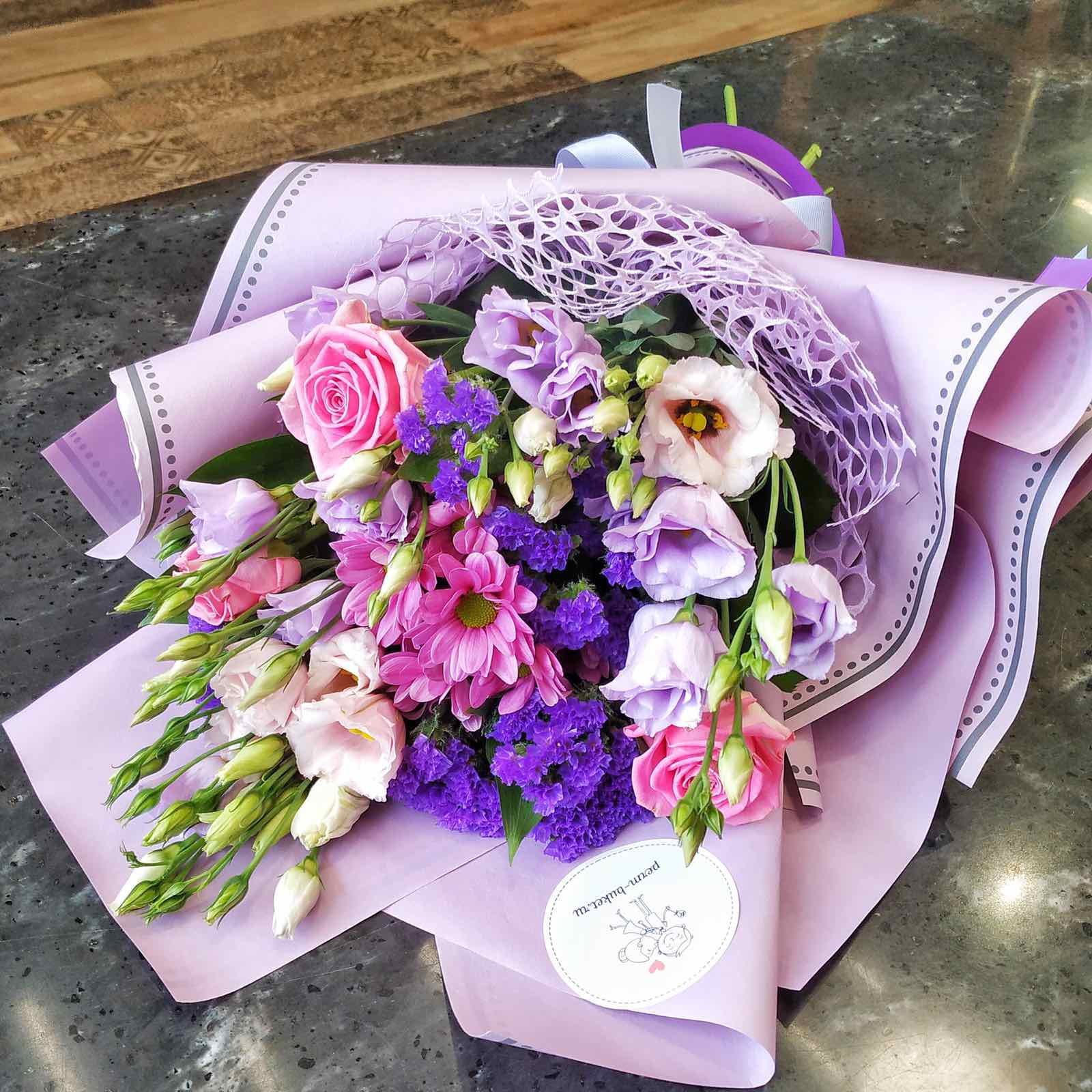 Состав: 4 веточки эустом, 3 розовые розы, веточка хризантемы и статица для украшения