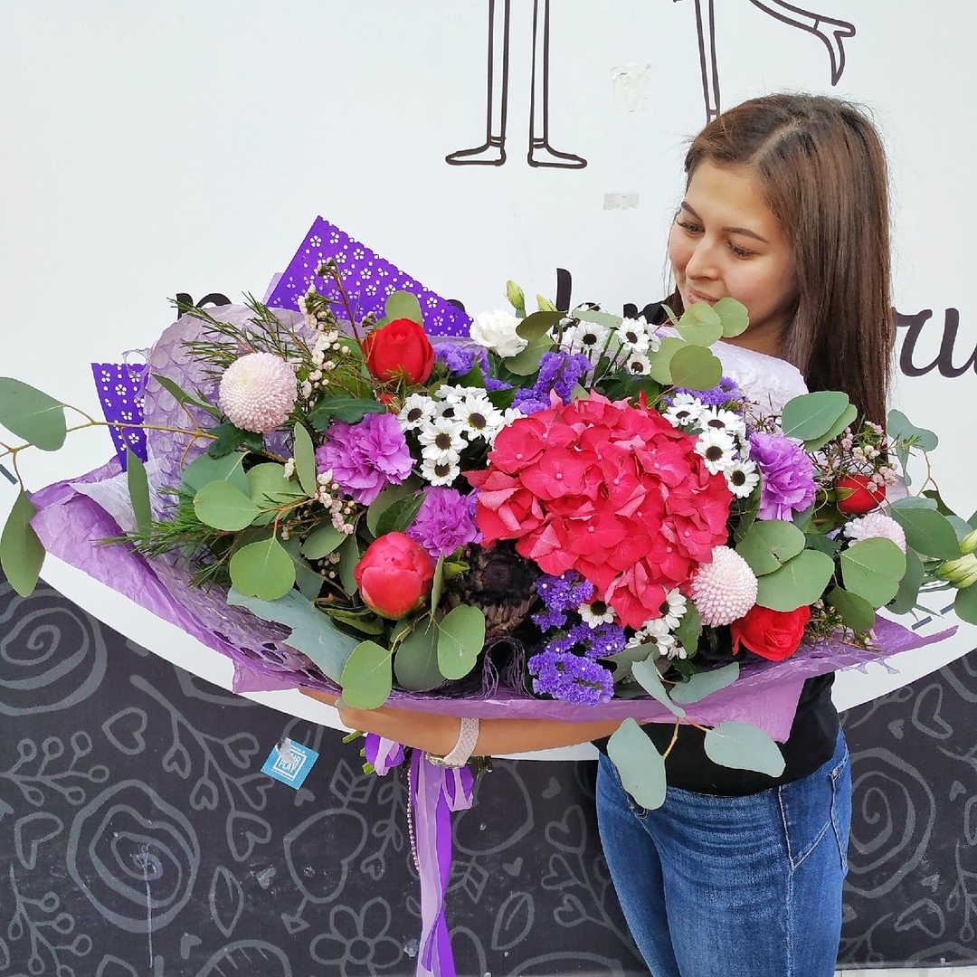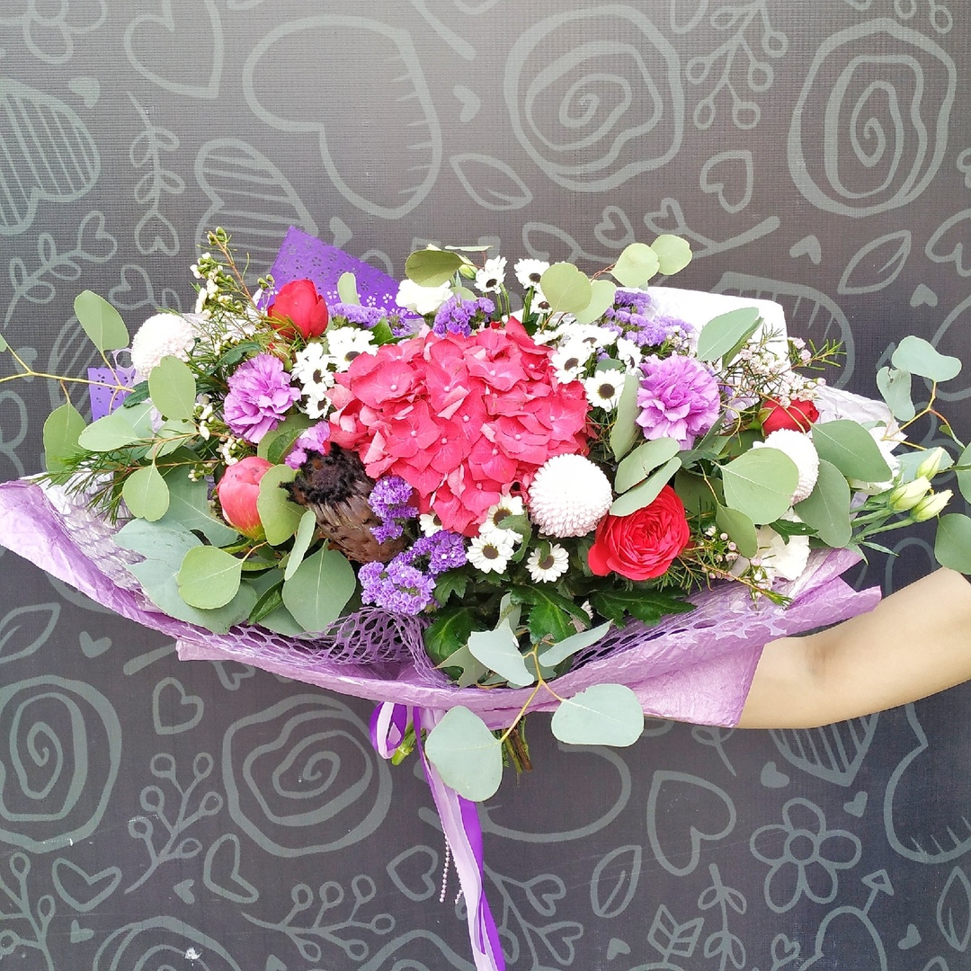 Букет состоит из 1 гортензии, 1 протея, 3 хризантемы одиночных, 4 веточки кустовых, 3 эустомы, 1 пион, 3 гвоздики одиночных, 3 пионовидной розы, статицы, хамелациум, эвкалипт и флористическое оформление.