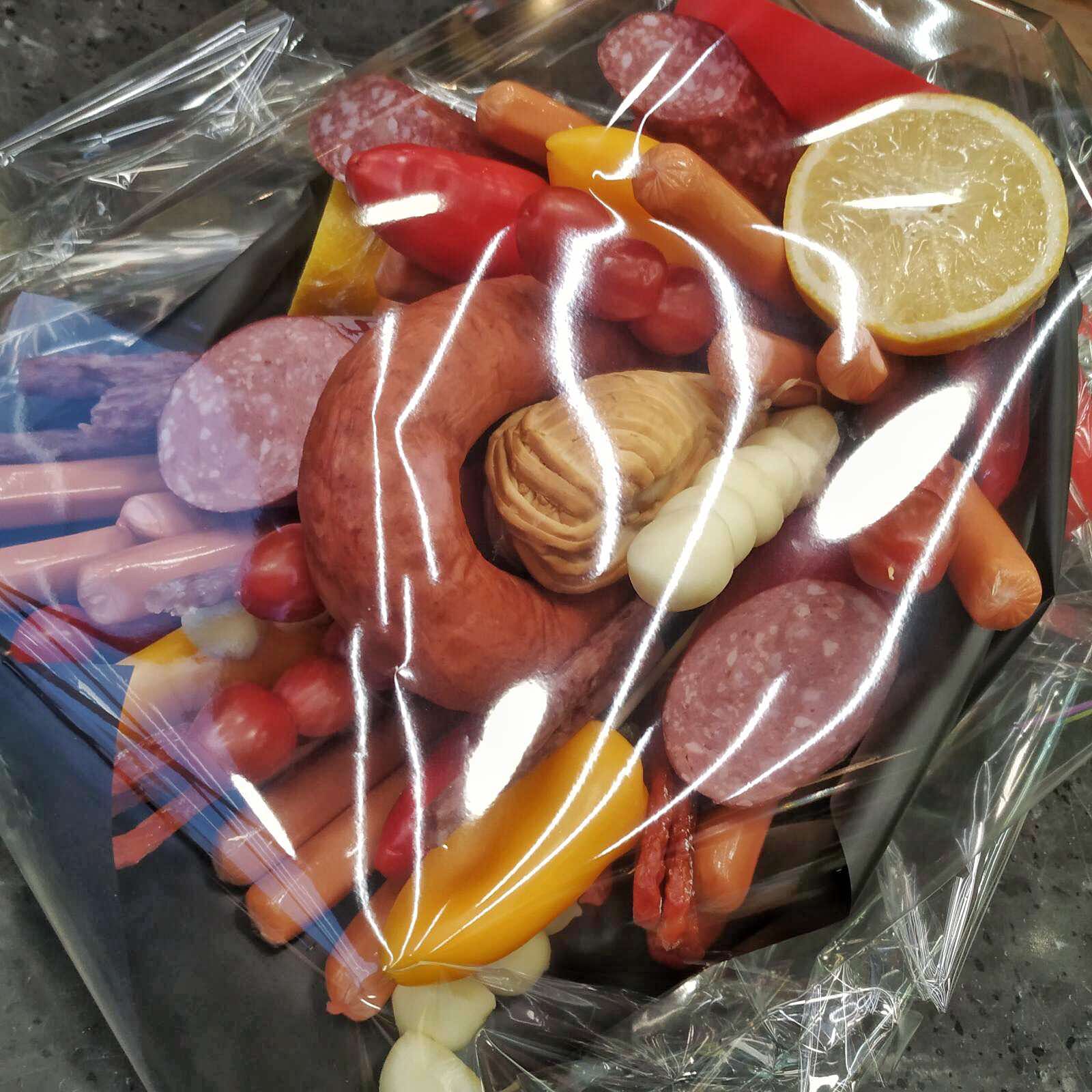 Состав: колбаса варёно-копчёная, колбаски вяленные , швейцарские колбаски, сыр косичка копчёный, помидоры черри, сыр сливочный, перец, лимон.