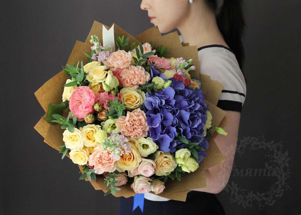 Яркий, насыщенный букет из 1 гортензии (цвет может меняться), 2 кустовых пионовидных роз, матиоллы, 7 веточек белой или кремовой эустомы, 5 розовых гвоздик, 2 веточки розовой кустовой розы и 13 одиночных кремовых роз в офомрлени и с зеленью и ленточками.