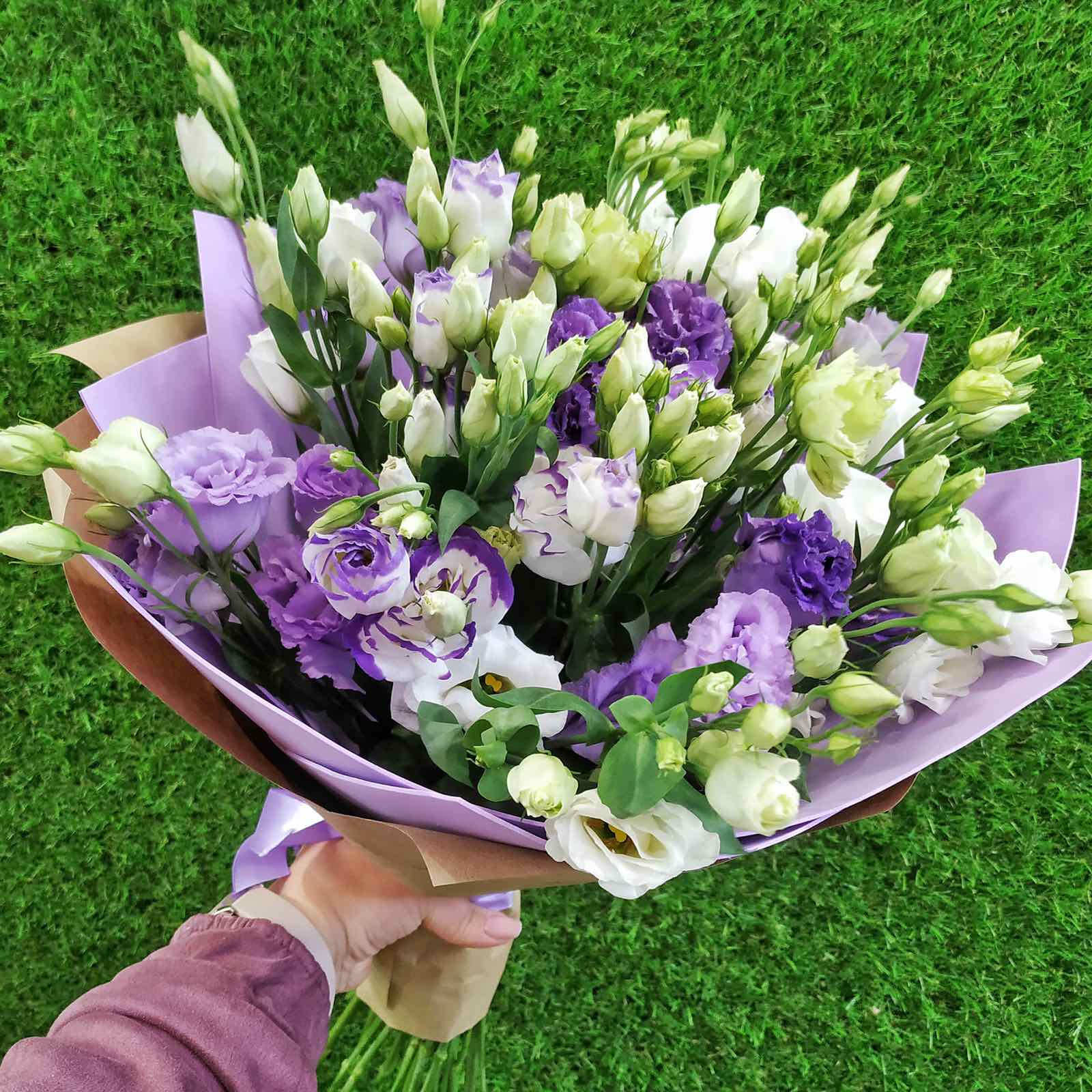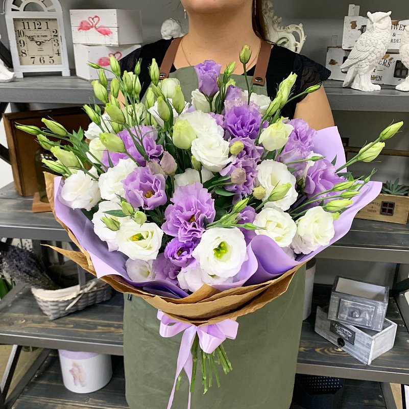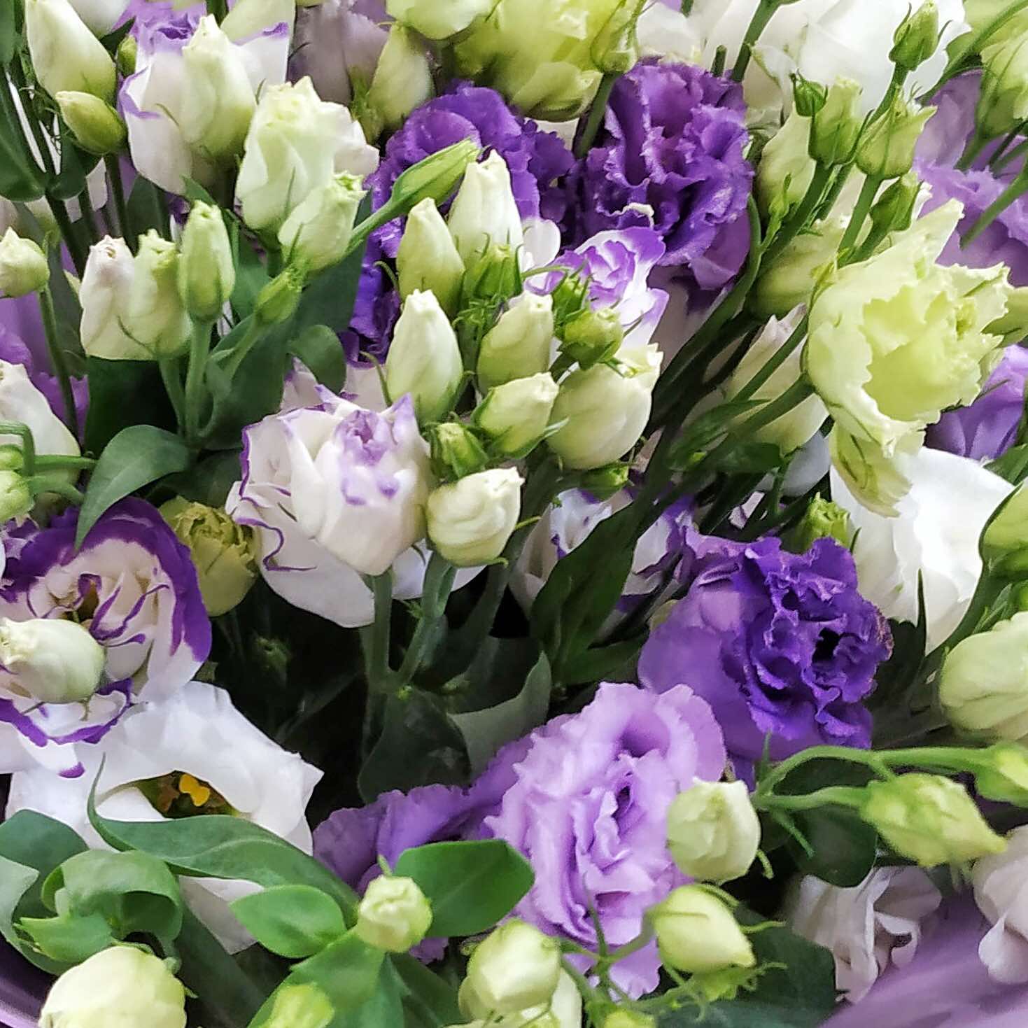 Нежный и воздушный букет из 19 белых и сиреневых эустом.