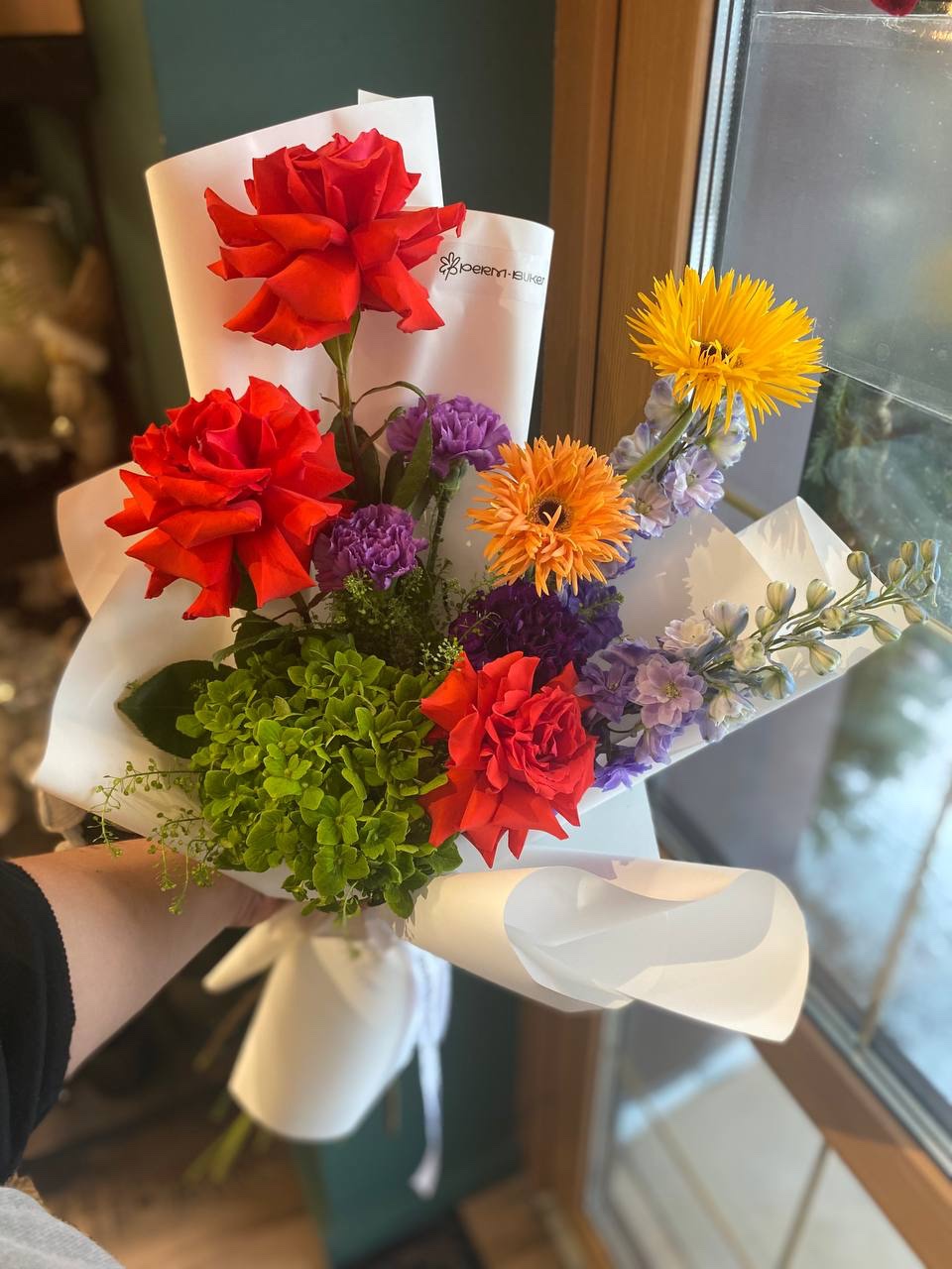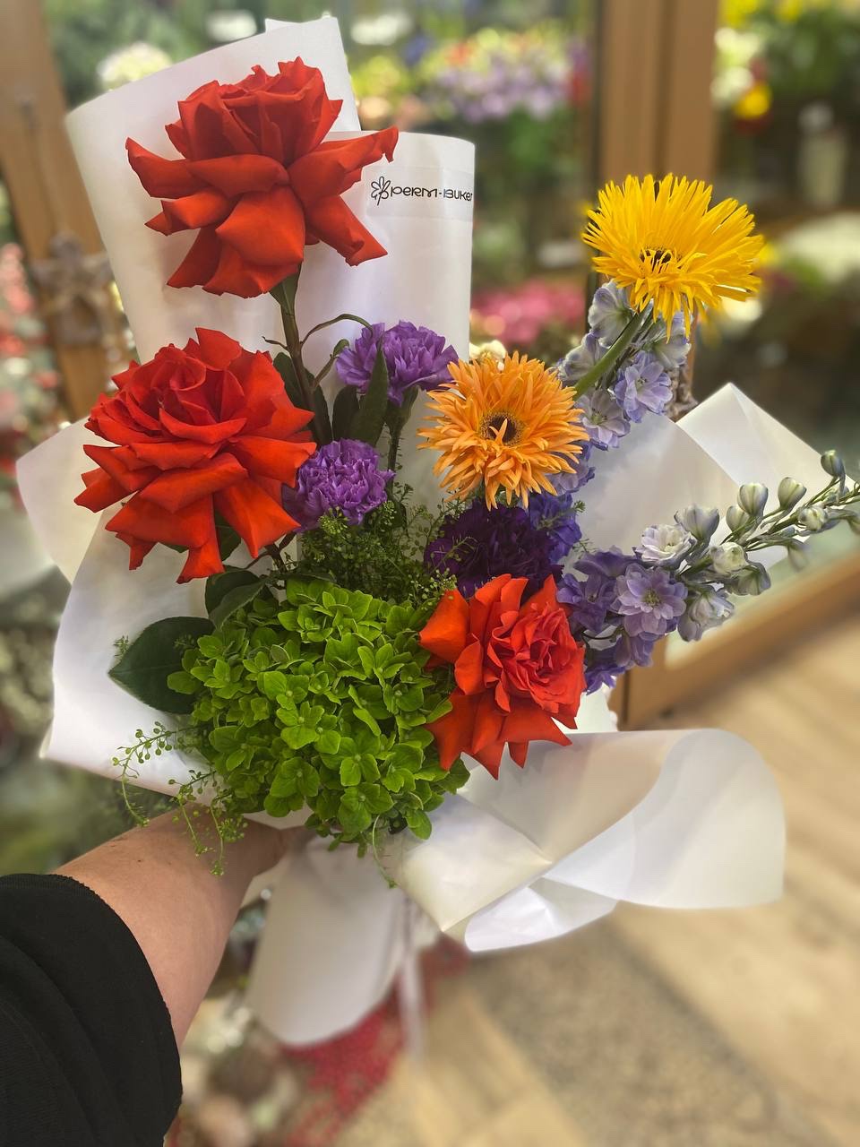 Шикарный огненный букет из роз сорта Нина, зеленой гортензии, диантусов, гербер и дельфиниума