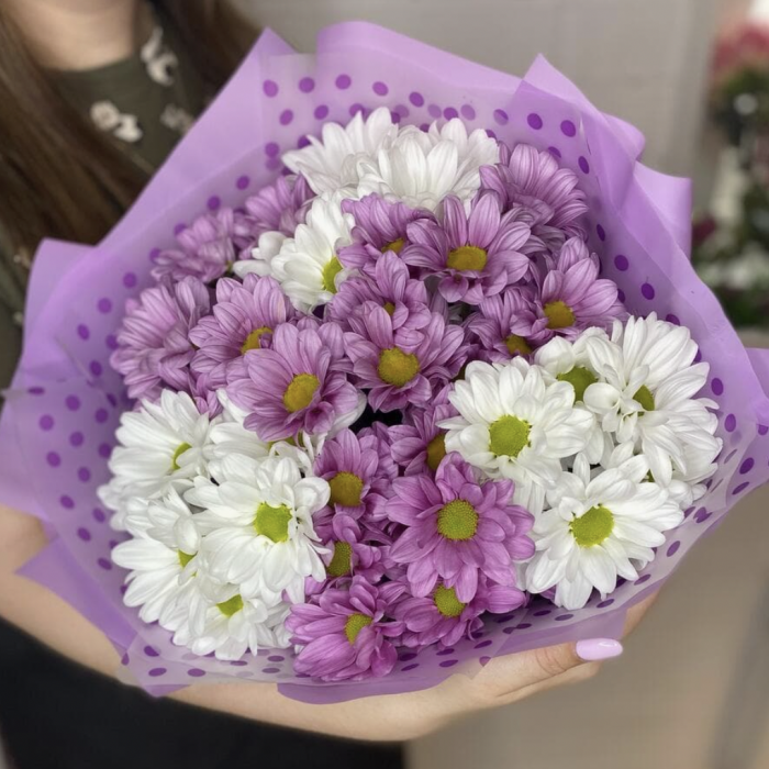 Состав: 5 хризантем кустовых, микс белые и сиреневые.
