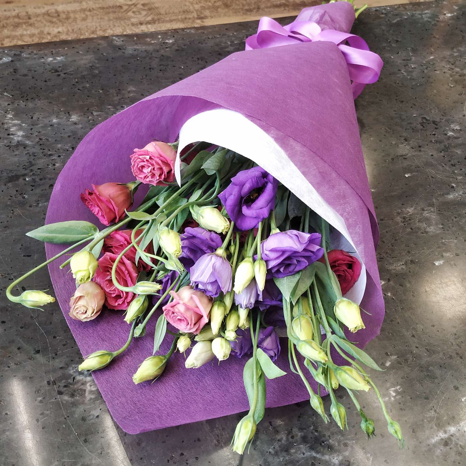 Прекрасный букет из 7 нежных эустом в ярком фиолетовом оформлении.