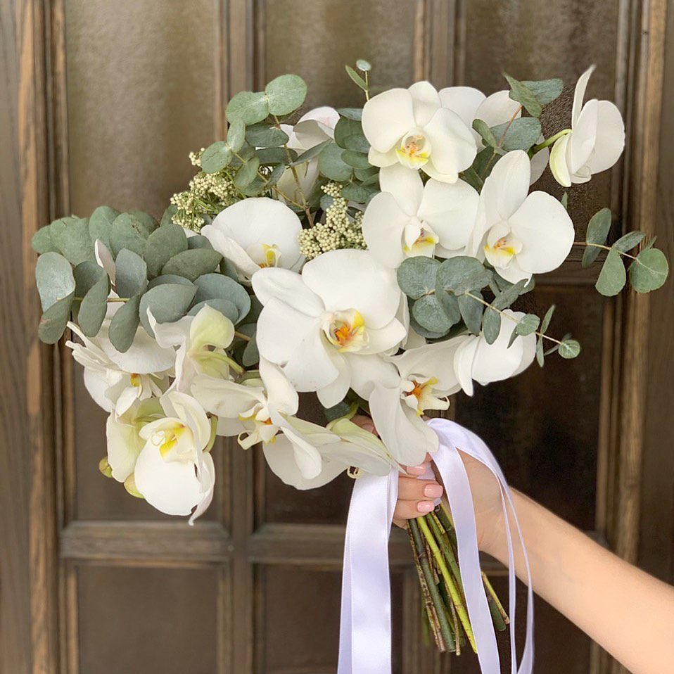 Букет состоит из 15 белых орхидей, эвкалипта. Оформление лента