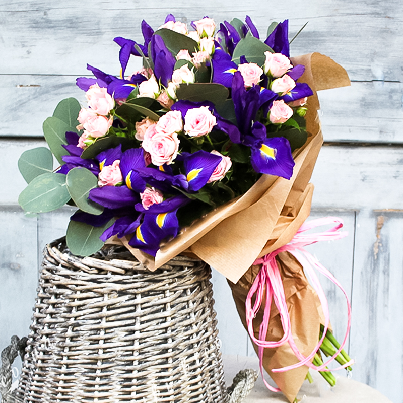 Состав: 10 ирисов и 5 веточек нежной кустовой розы, зелень.