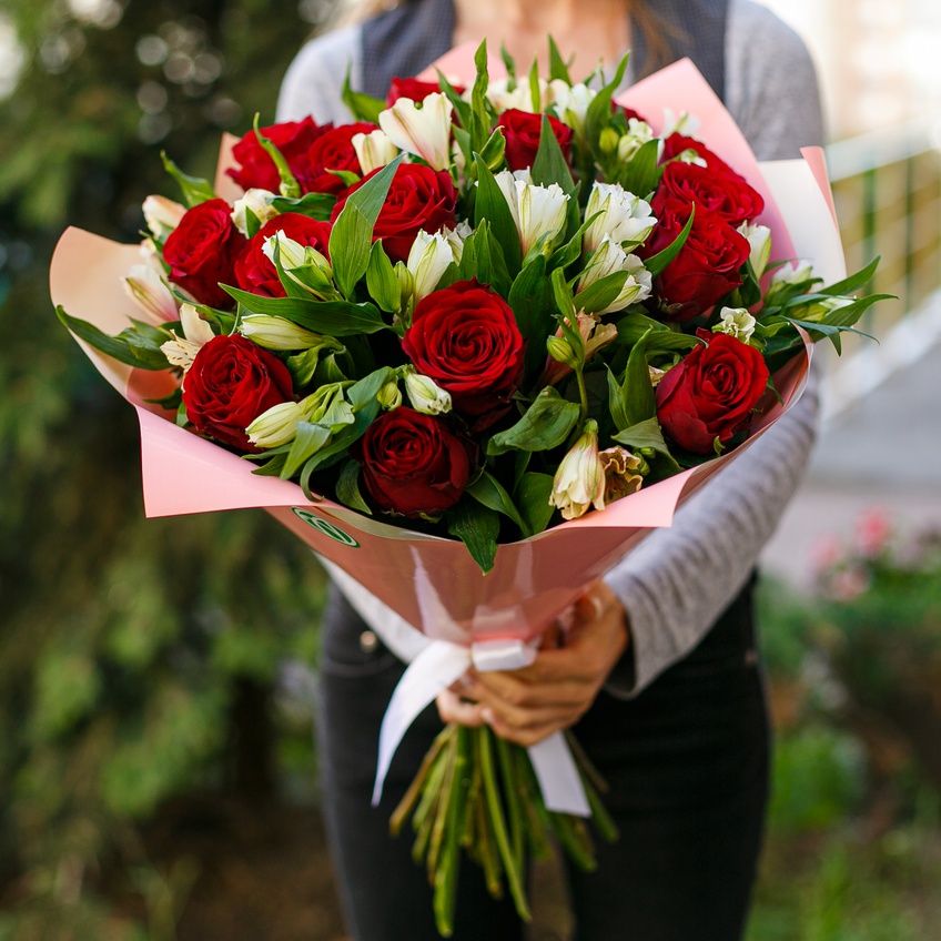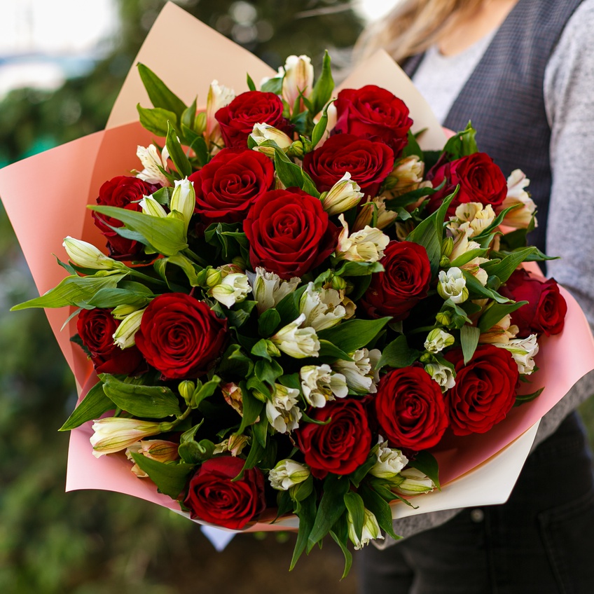 Букет из красных роз 50 см и альстромерии
