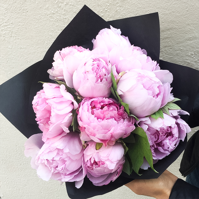 Сочетание нежно розовых пионов с черным крафтом придает букеты строгость, роскошь и солидность.