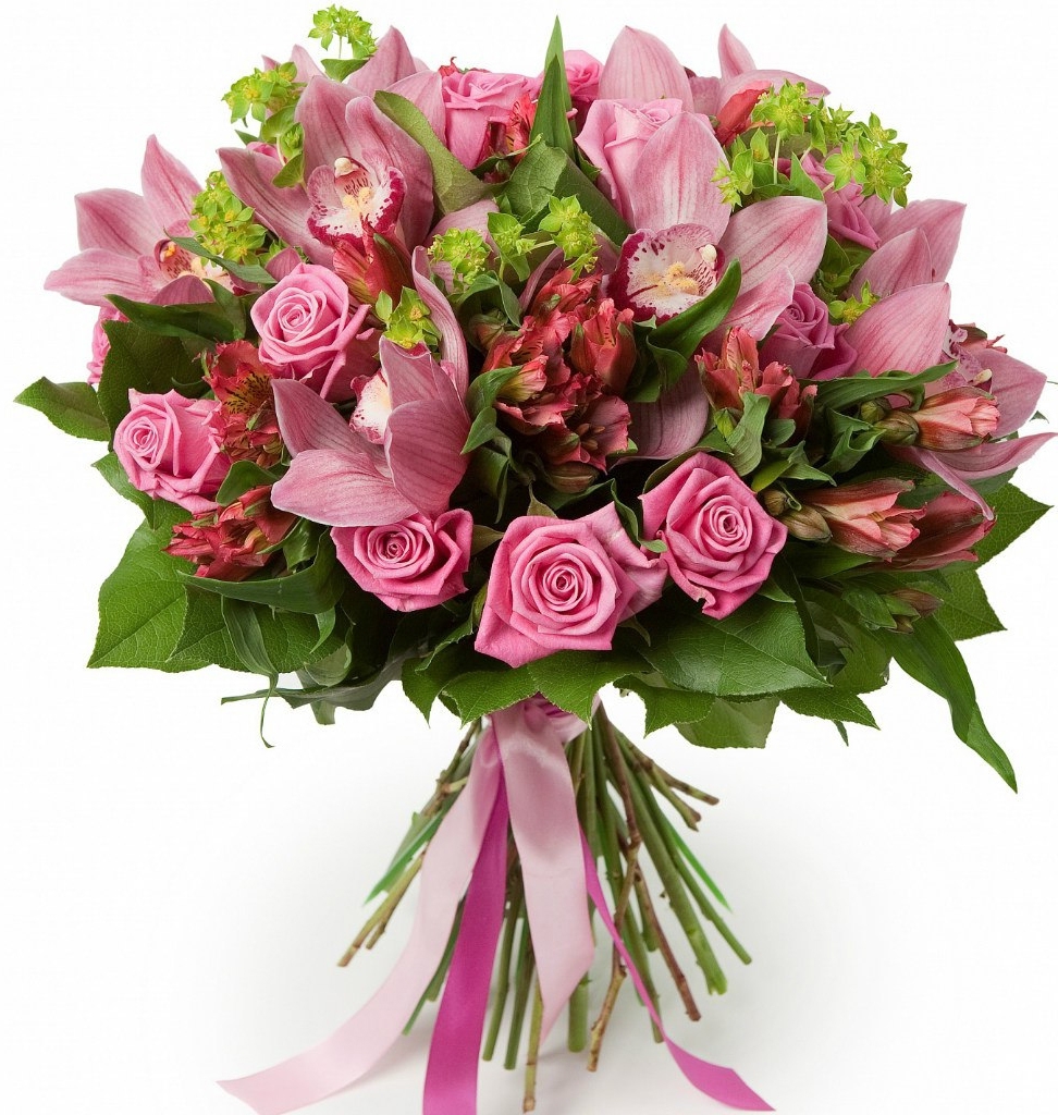Состав: 5 розовых орхидей, 9 розовых роз и 8 веточек альстромерий.