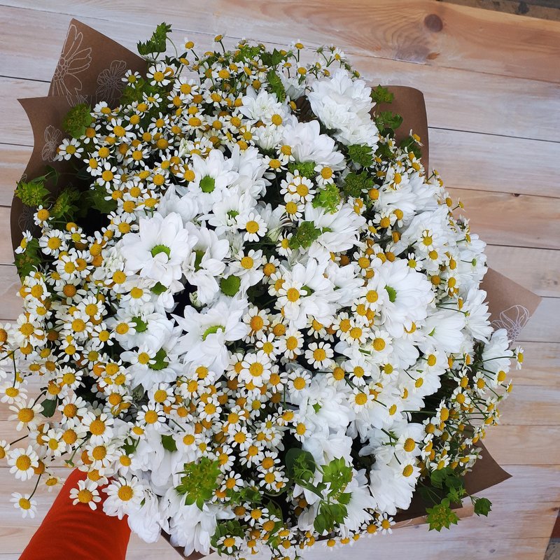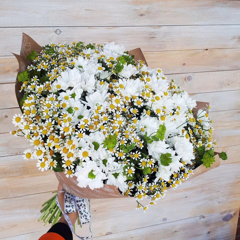 Состав: 7 кустовых хризантем и 15 веточек камиллы