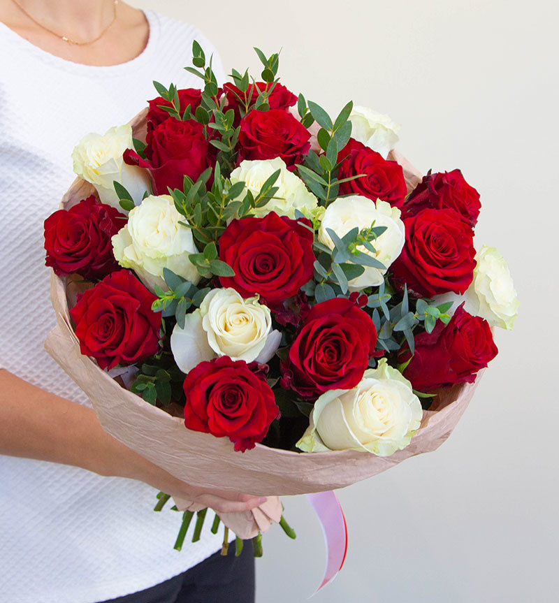 Букет из 21 розы 70 см в красно-белой гамме с добавлением зелени и в стильной упаковке