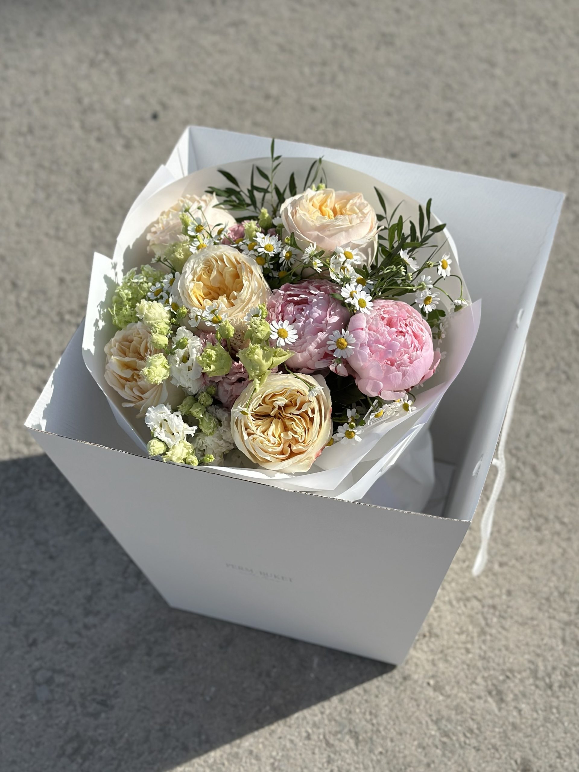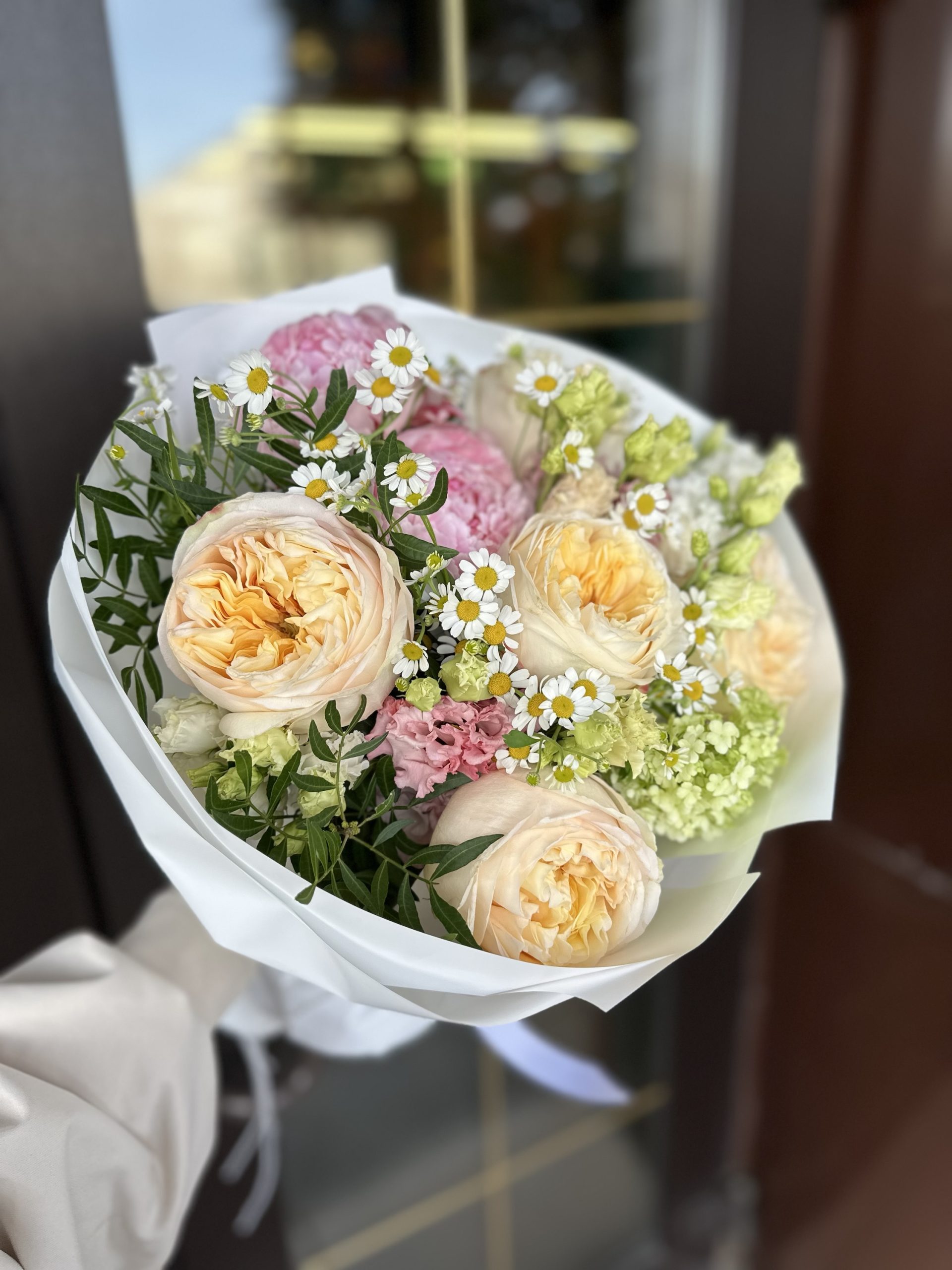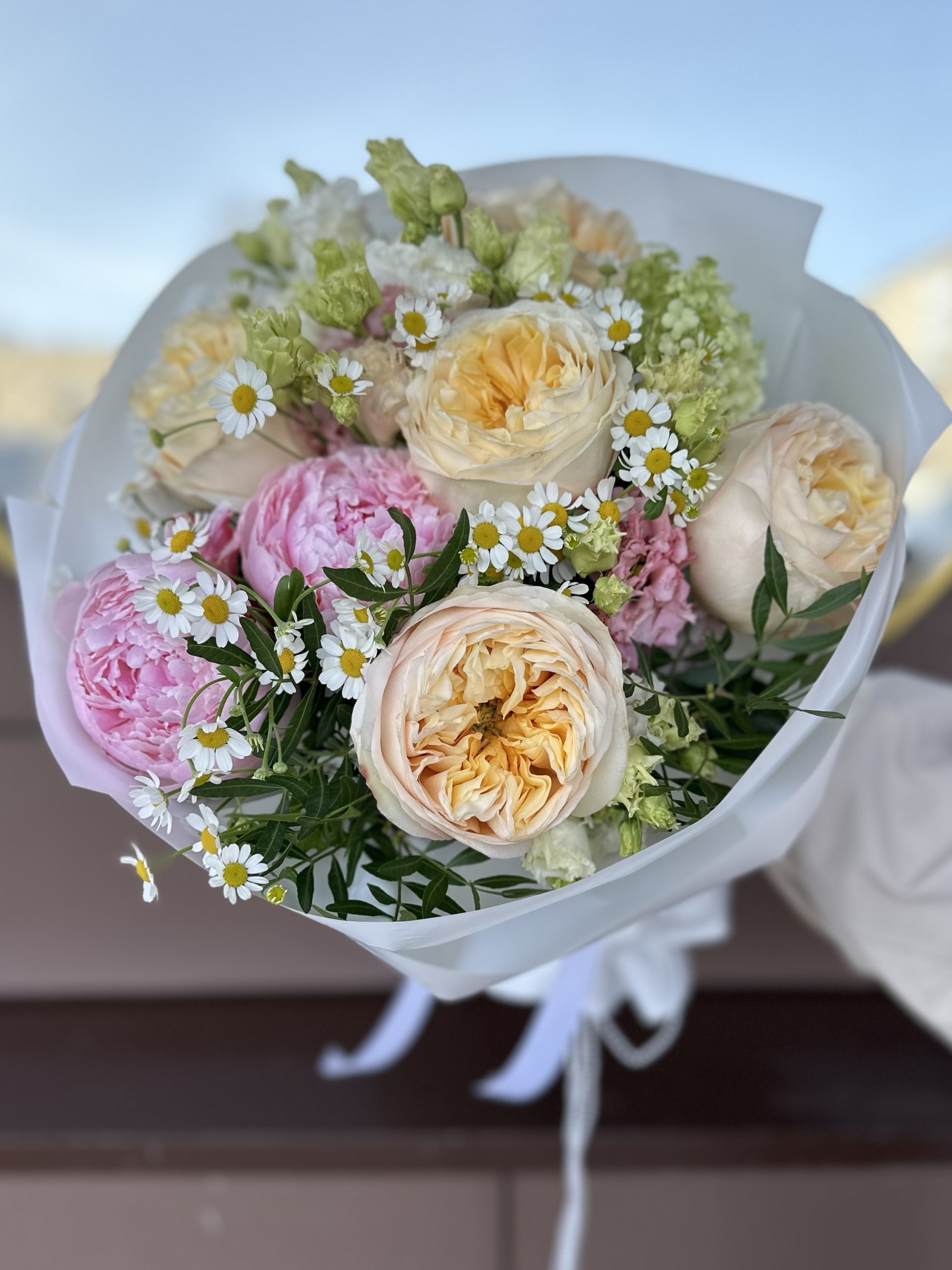Состав: 5 роз эквадор, пионы, Камилла, эустома