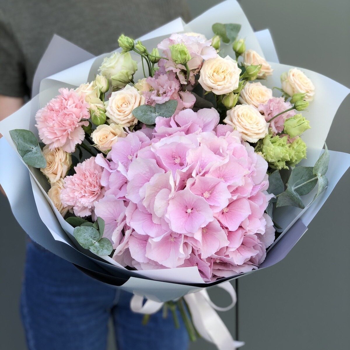 Состав: гортензия, 3 гвоздики, 3 веточки кустовой розы, 2 эустомы, зелень.