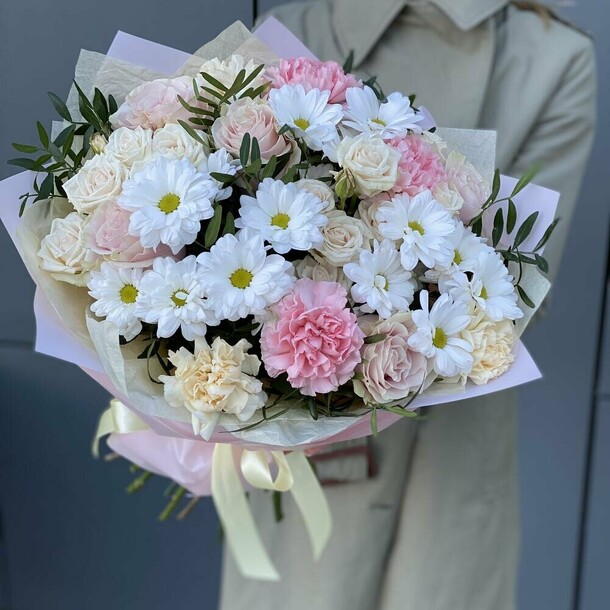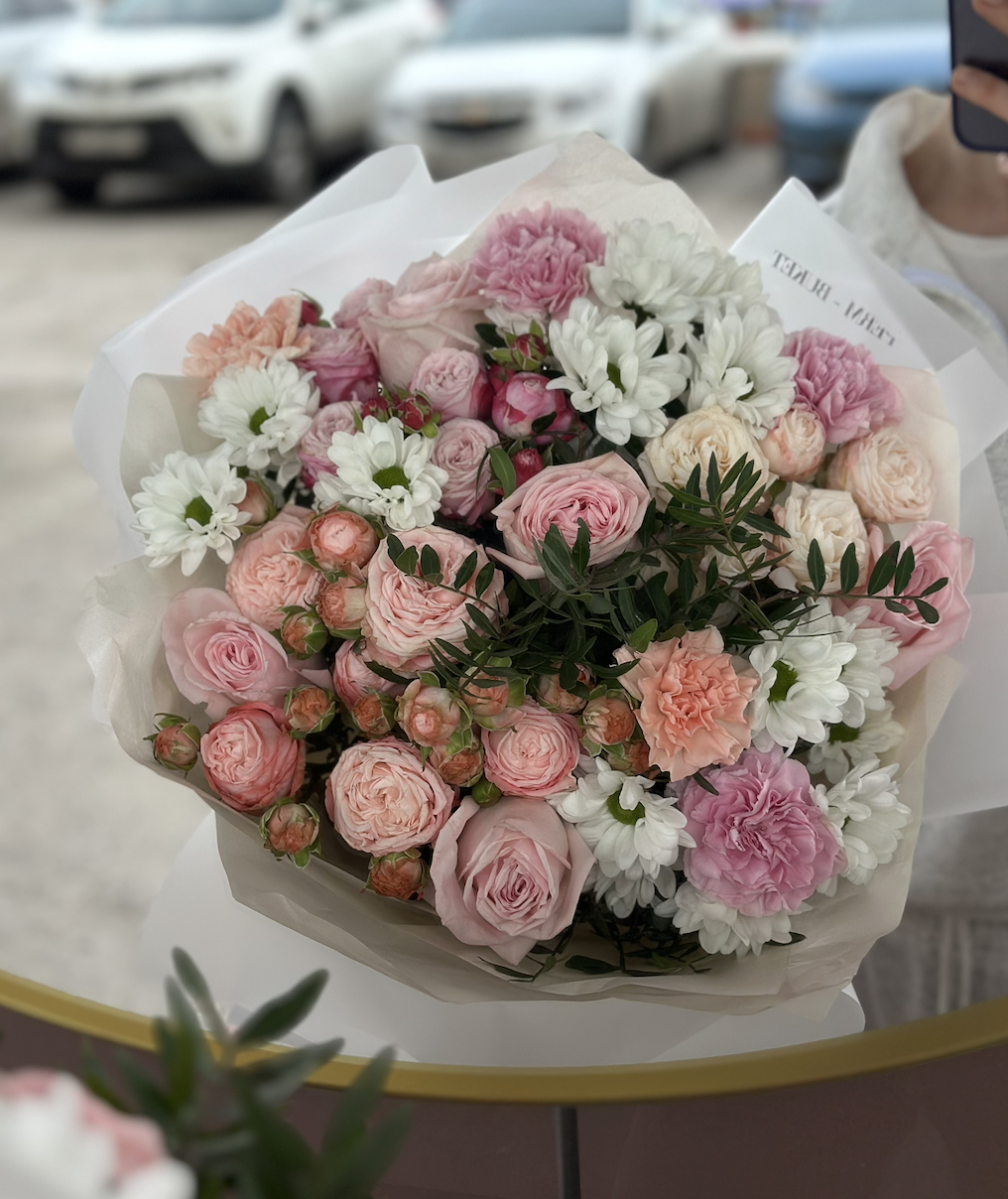 Состав: 5 гвоздик, 5 роз Эквадор, 3 хризантемы, 3 кустовые розы, писташ