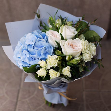 Состав букета: гортензия, 2 веточки кустовой розы, 2 альстромерии, 3 розы голландской, зелень.