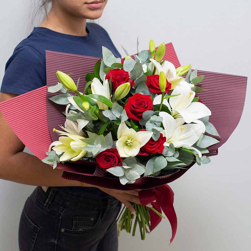 Состав: 3 лилии, 7 красных роз 70 см., эвкалипт.