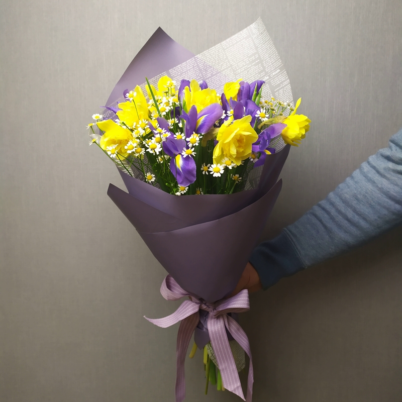 Весенний букет из 9 ирисов, 9 нарциссов, 5 камилл.