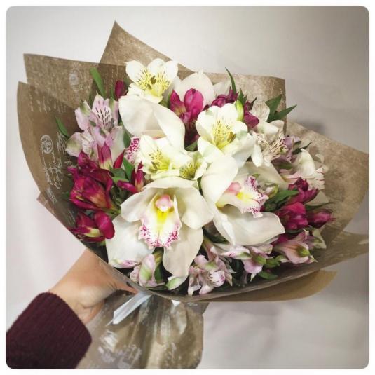 Состав: букет из 5 орхидей и 9 альстромерии.