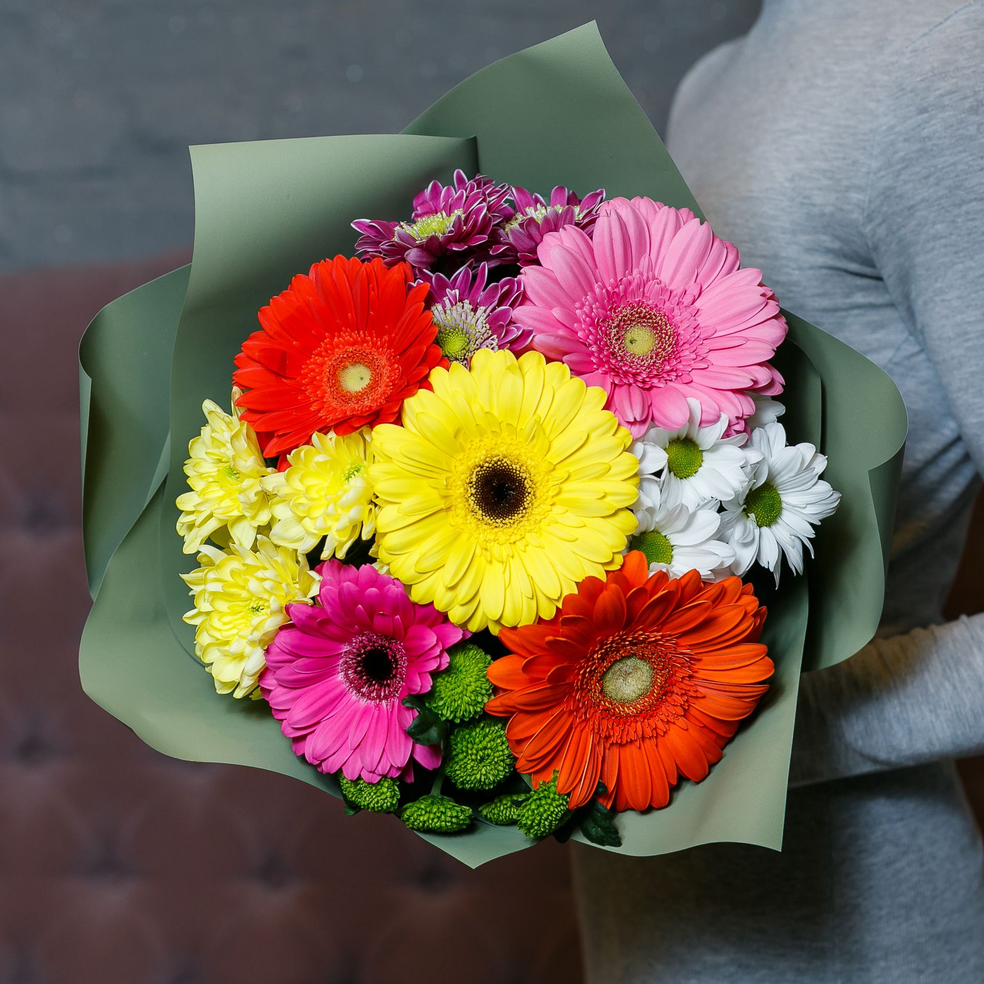 Состав букета: 5 разноцветных гербер, 4 разноцветные кустовые хризантемы.