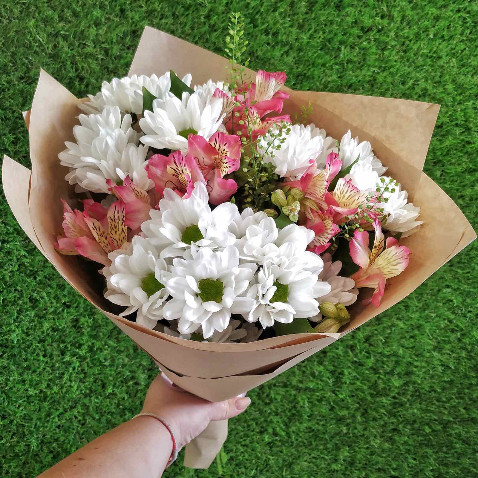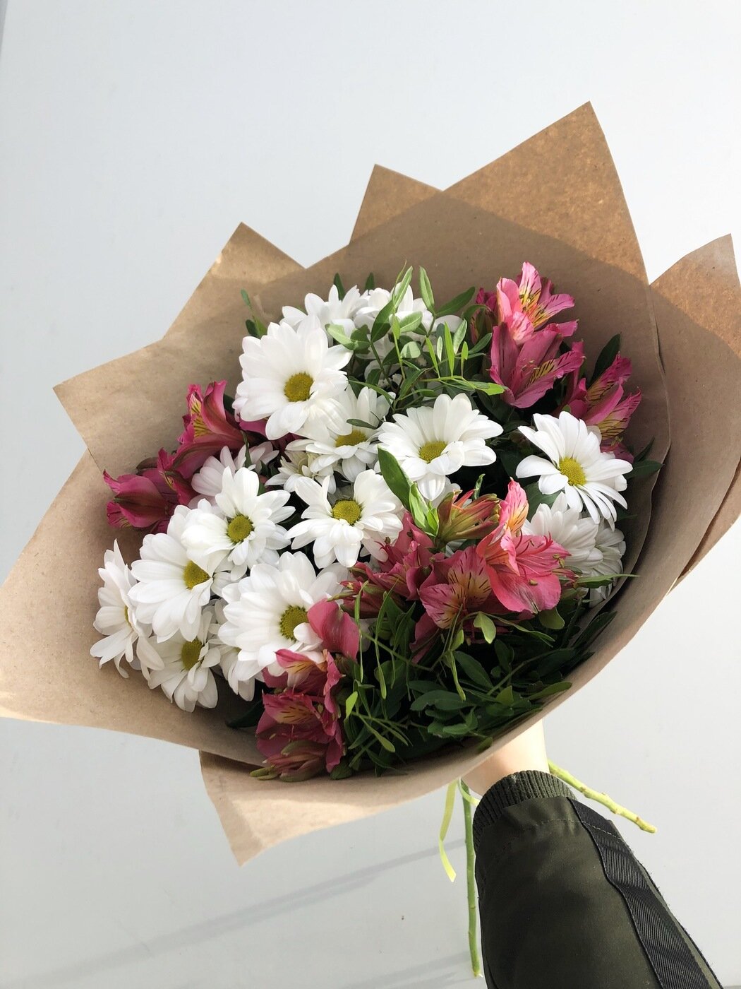 Состав: Букет из 3 хризантем, 4 альстромерий, зелени в крафт оформлении.