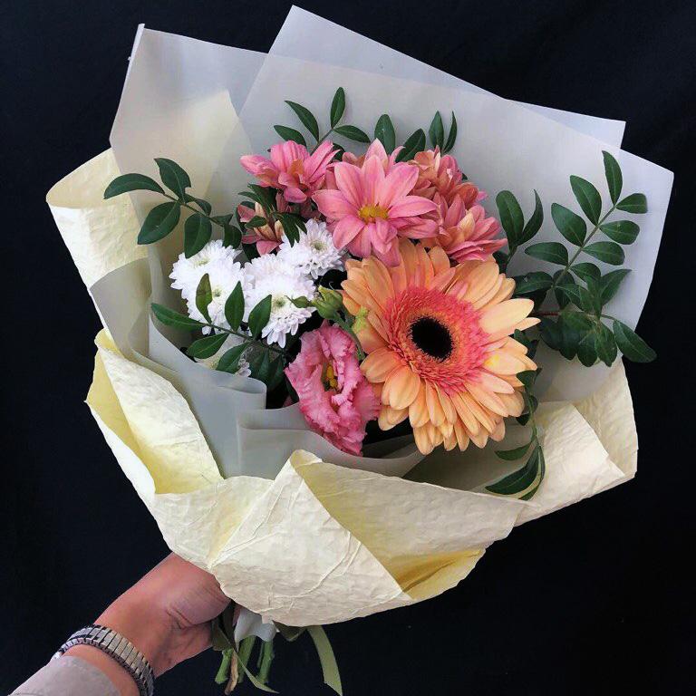 Состав: 2 кустовые хризантемы, эустома, гербера, зелень.