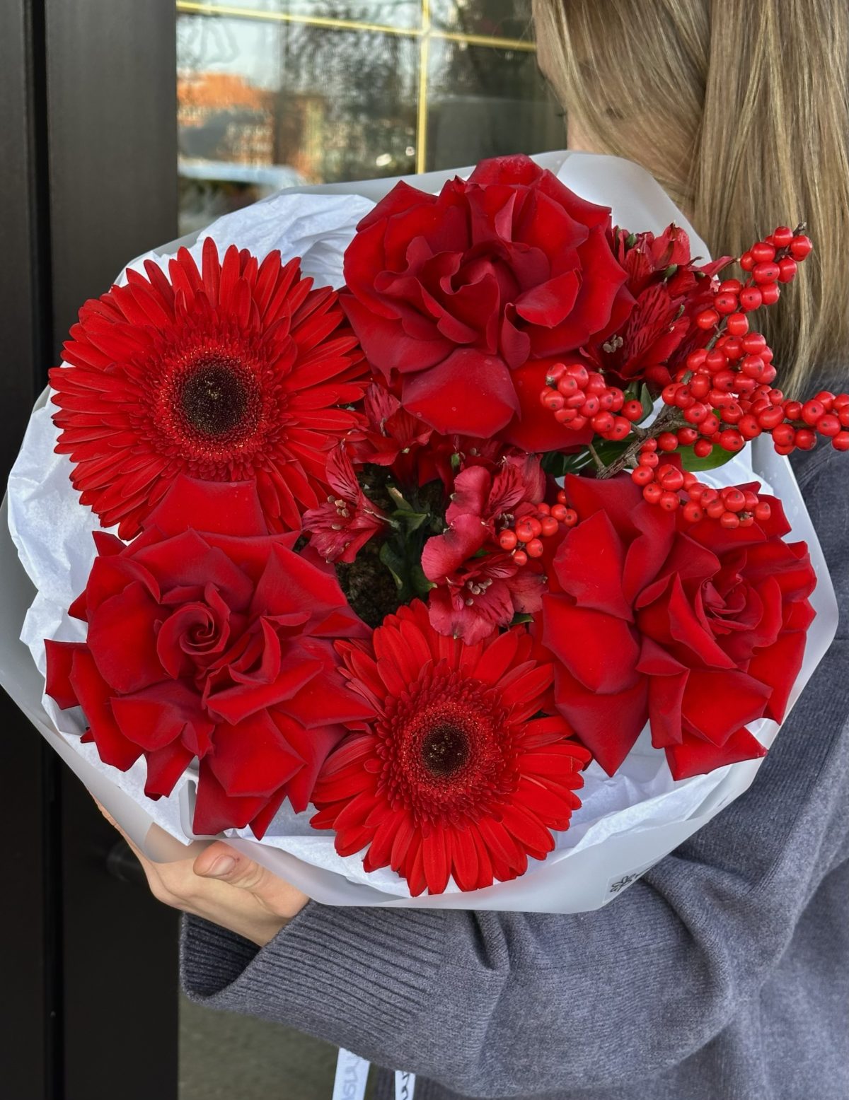 Состав: 2 герберы, 3 французские розы, 2 альстромерии, Илекс