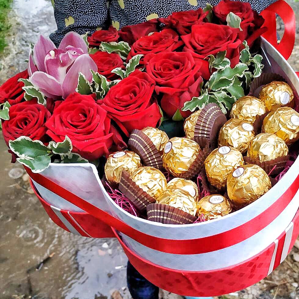 Коробка в виде сердца с розами (13 роз), орхидеей (цвет может отличаться) и конфетами Ferrero Rocher.