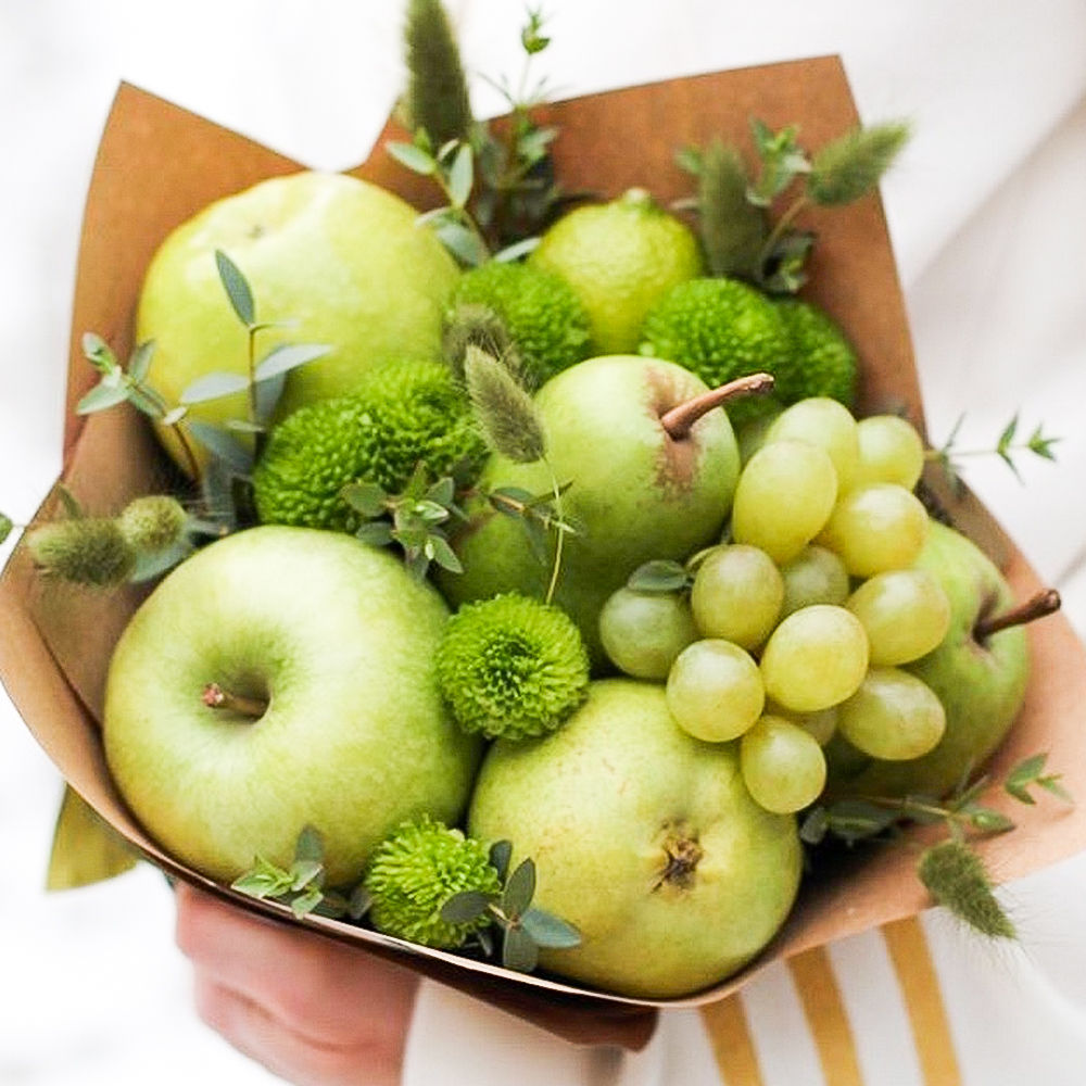 Состав: 4 шт зеленого яблока, горсть винограда зеленого, 1 груша, лайм и веточка зеленой хризантемы и зелень в оформлении.