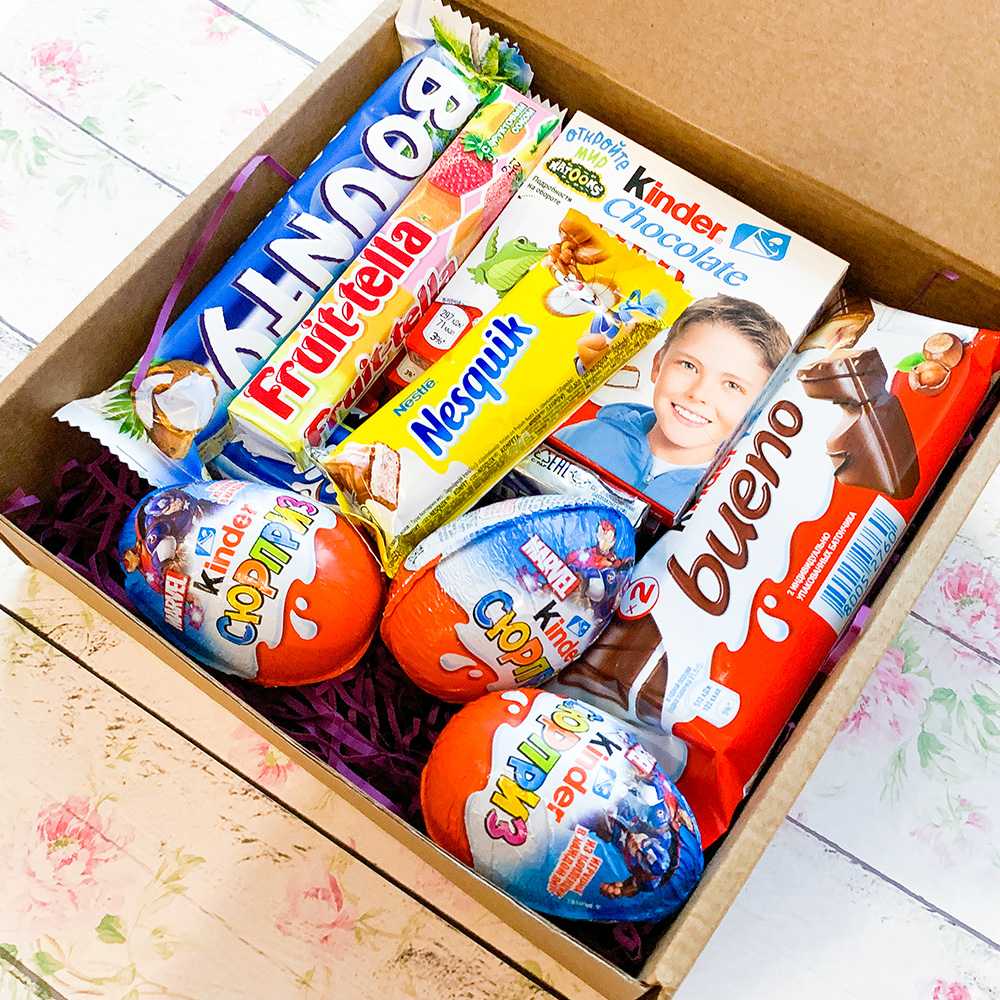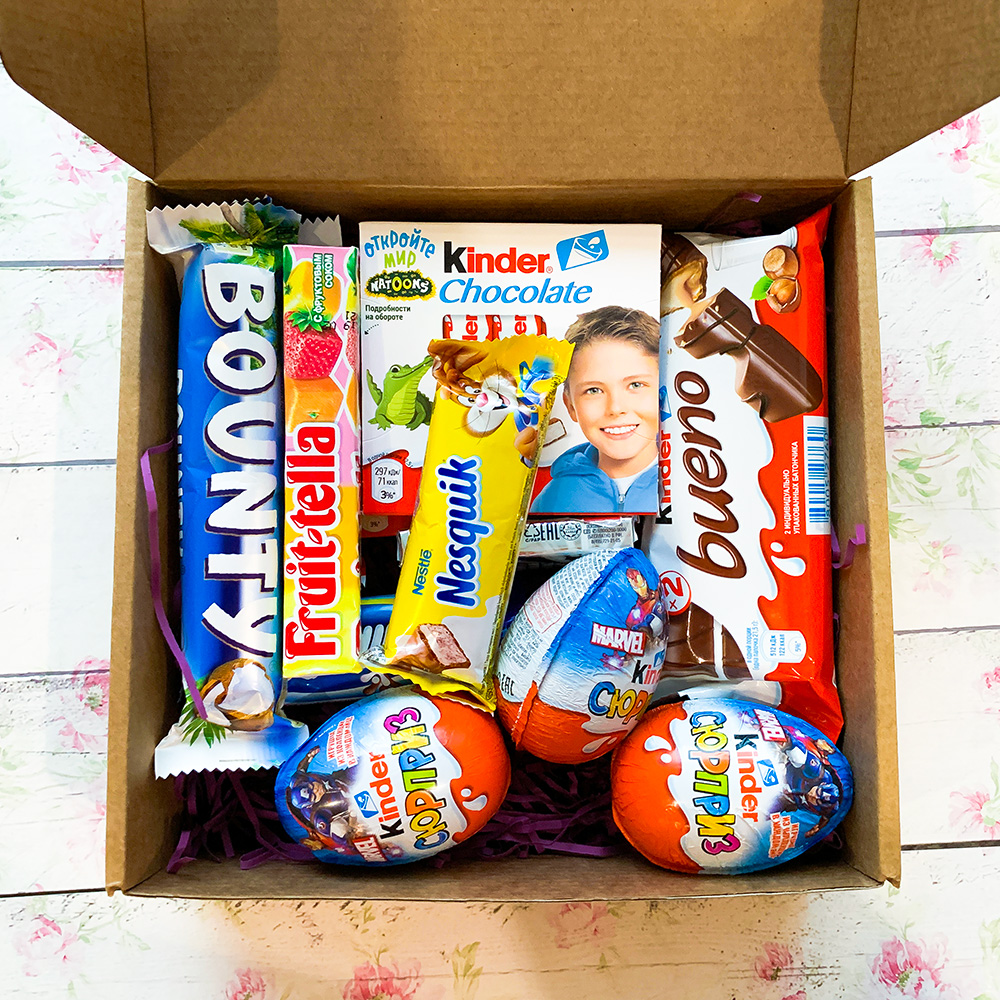 Состав: 3 киндер сюрприза, Фрутелла, Баунти, Несквик, Киндер Буена, коробка Киндера с 4 палочками, 2 плиточных киндера и пачка жевательных резинок Орбит.