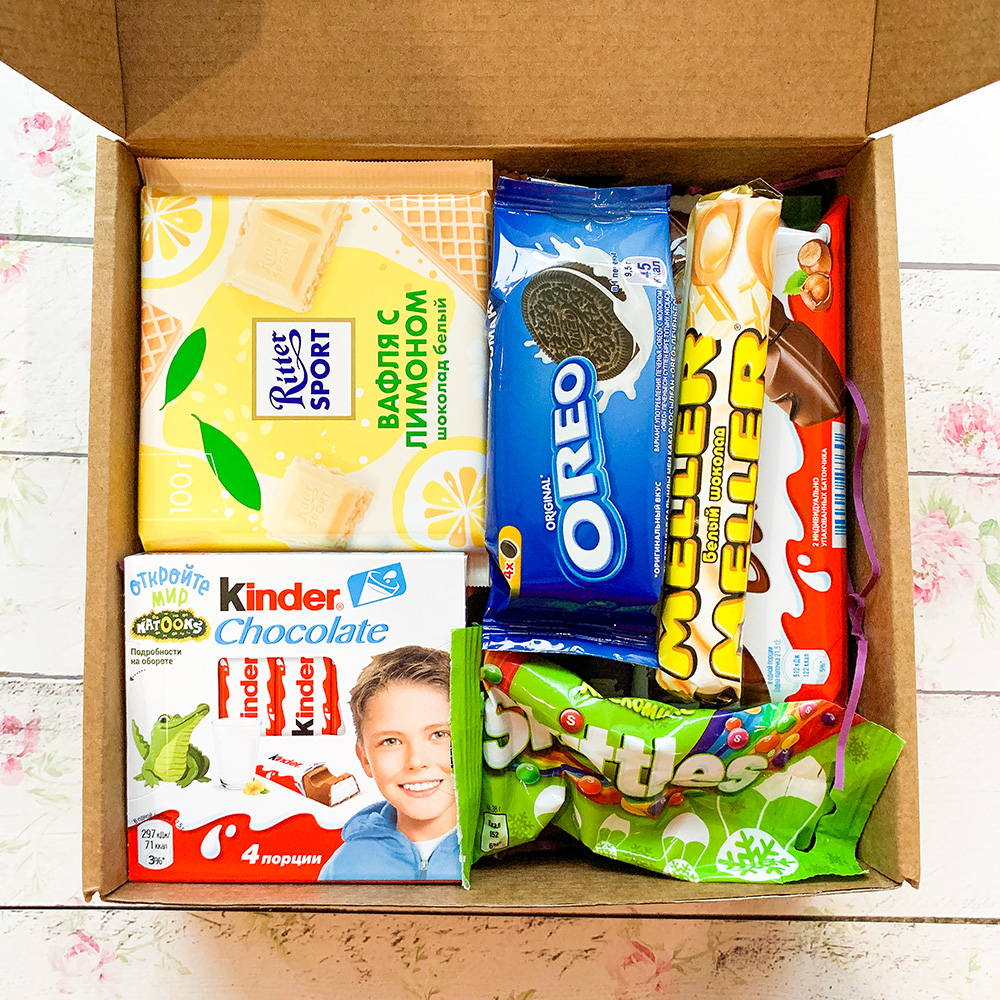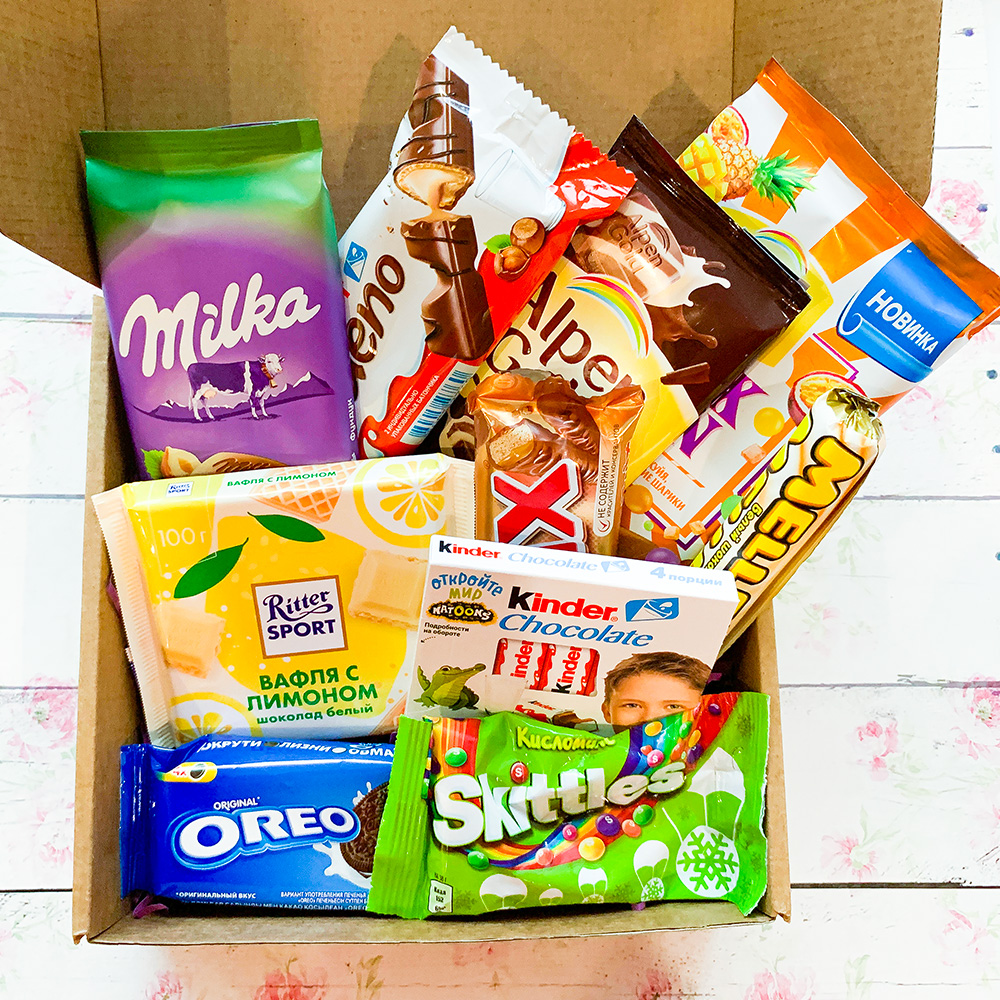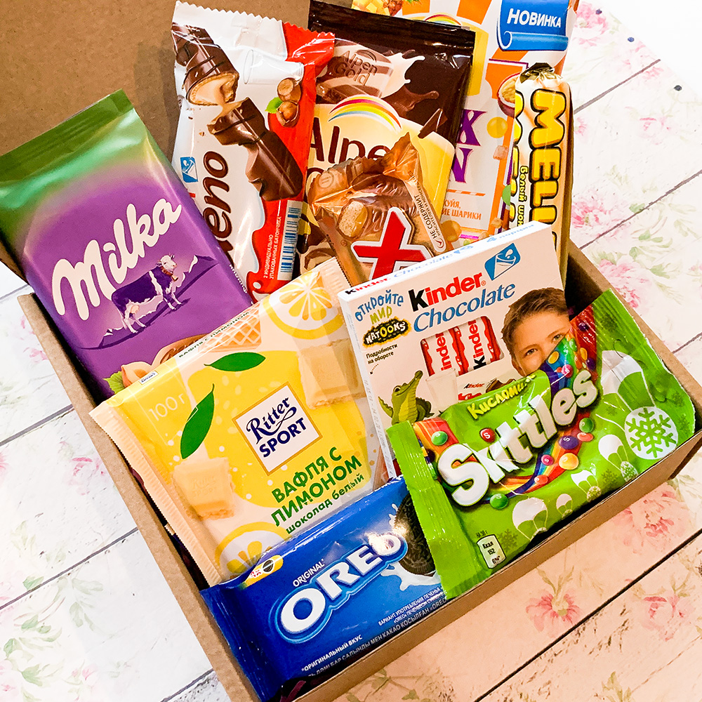 Состав: Шоколадки Милка, Альпен гольд обычный, Альпен гольд МахФан, Риттер спорт; батончик Твикс, Киндер Буено, Орео, Скиттелс, меллер.