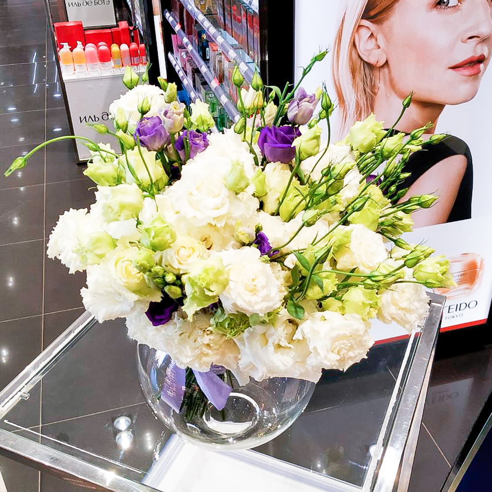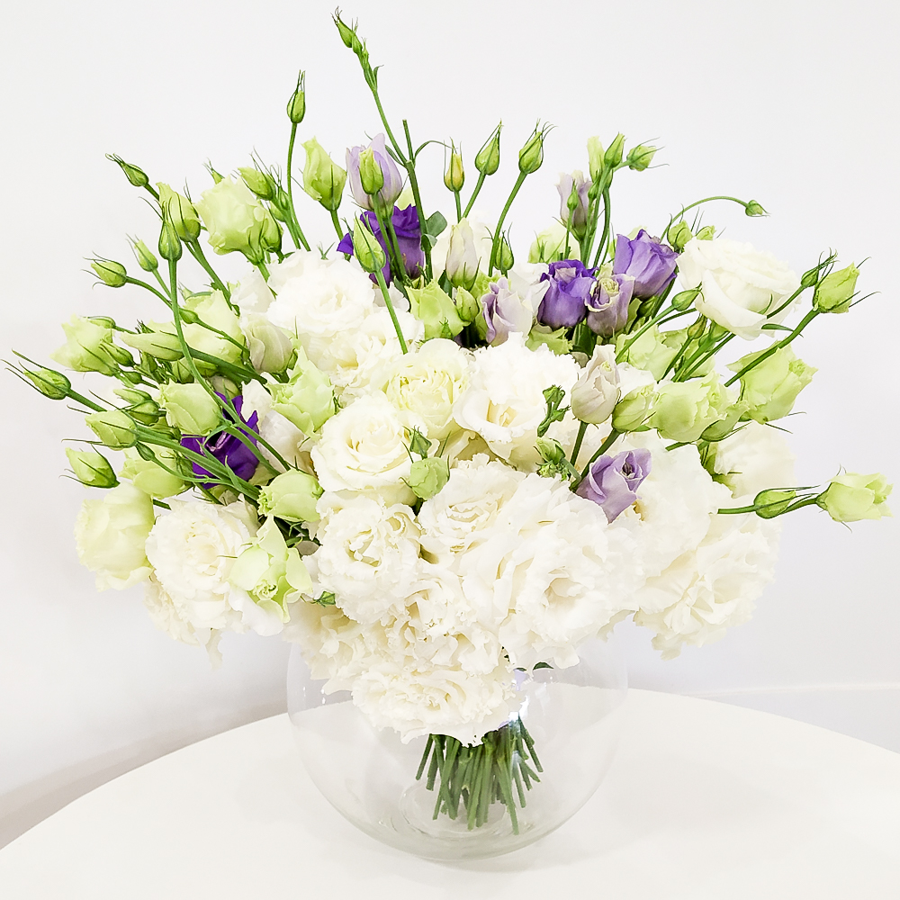Состав и способ оформления: 14 белых и 5 сиреневых эустом подрезаются под размер вазы это (20-30 см), перевязываются ленточкой и устанавливаются в вазу.