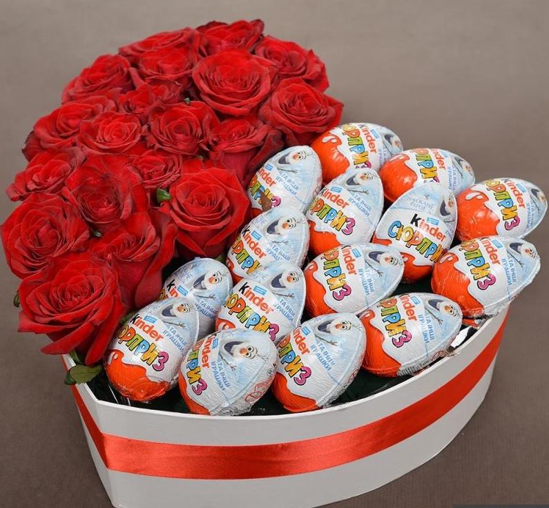 Состав композиции: 19 красных роз и 15 киндер сюрприза