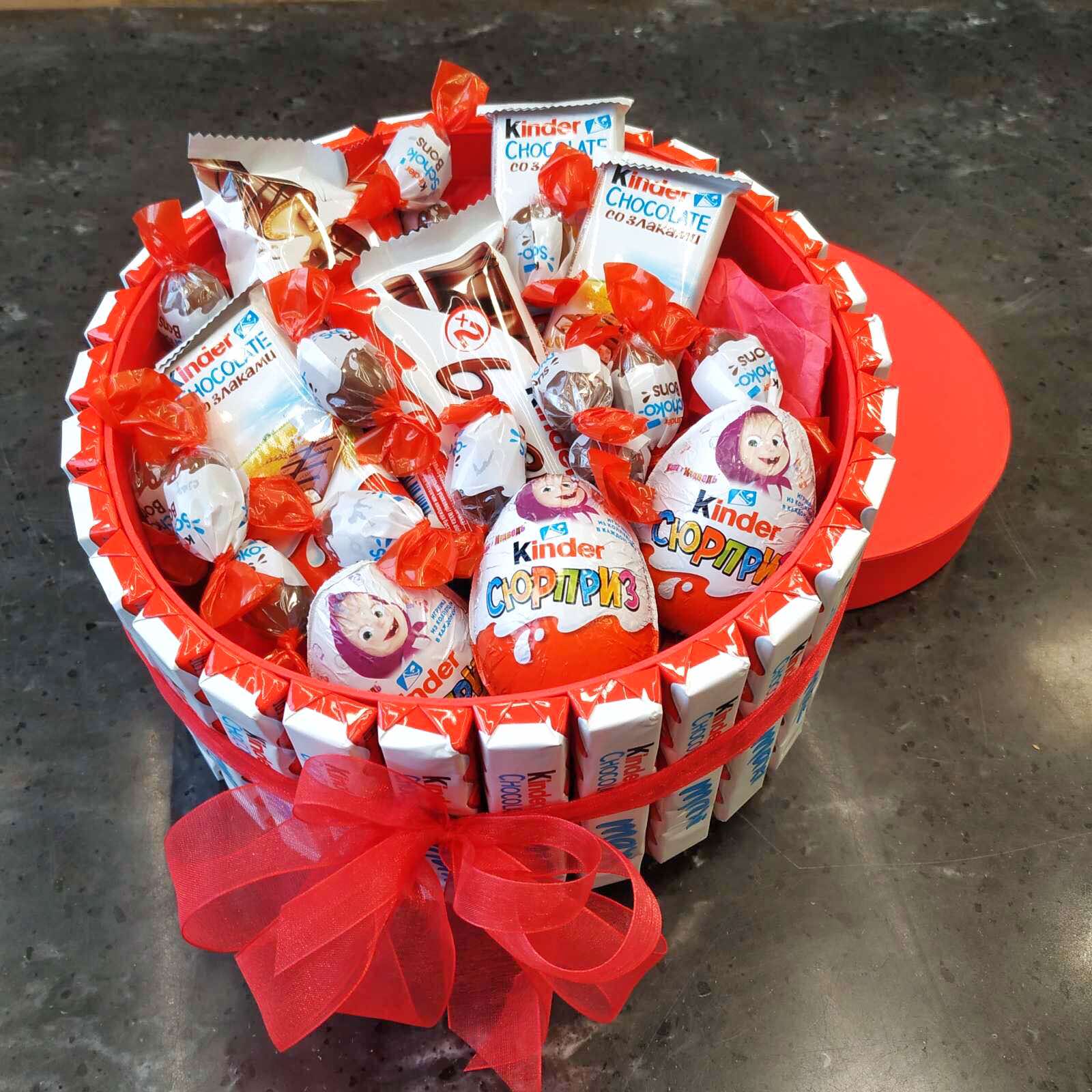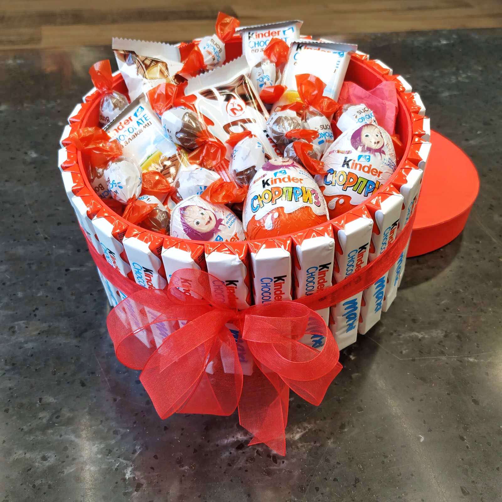 Состав: около 30 палочек Киндер Макси, 3 киндер сюрприза, 3 киндер кантри, 2 киндер буена, и несколько пачек маленьких конфеток киндер. Все это счастье оформляется в коробочку с бантиком :)