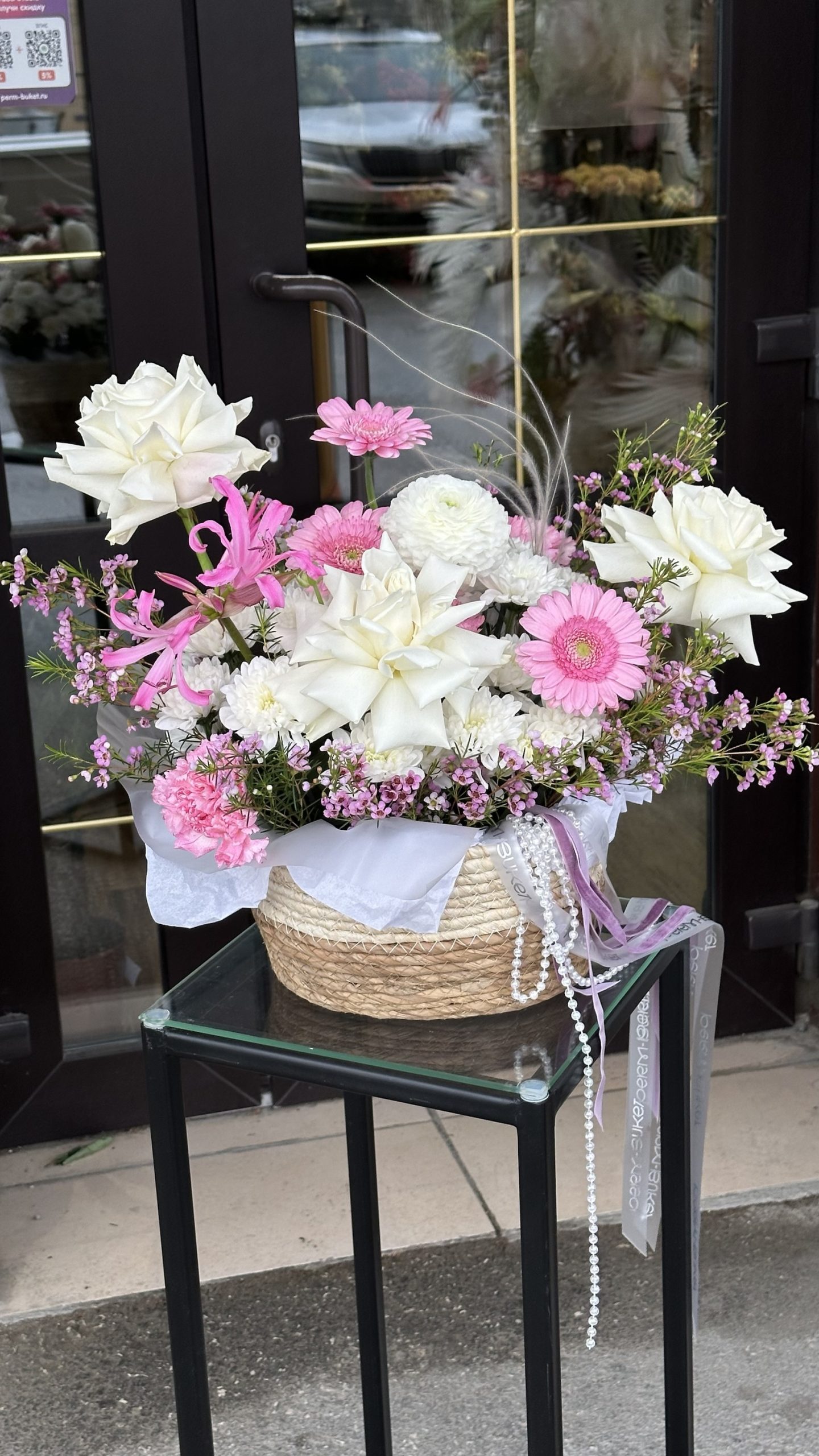 Состав: французская роза, эустома, кустовая роза, камила, гербера, хамелациум, кустовая хризантема, нарине, ранункулюс.