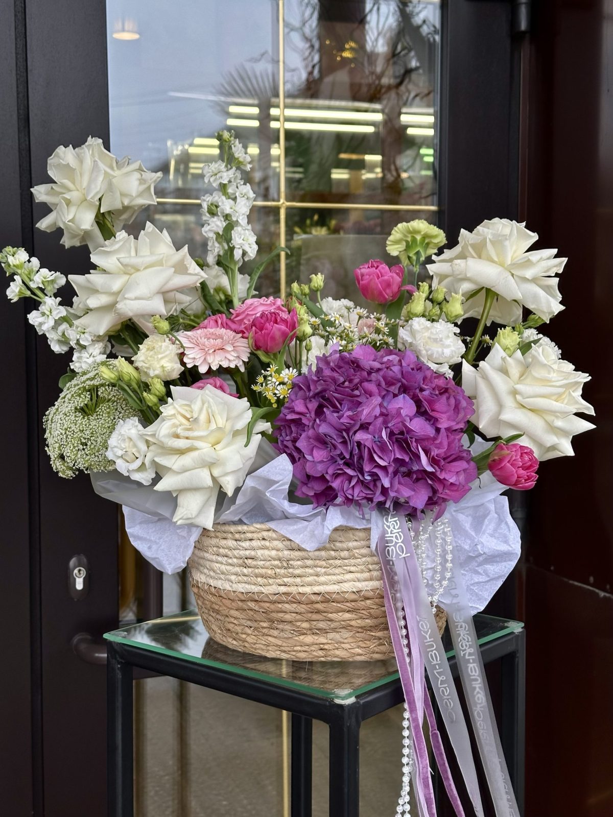 Состав: французская роза, эустома, гортензия, кустовая роза, камила, гербера, тюльпаны, маттиола.