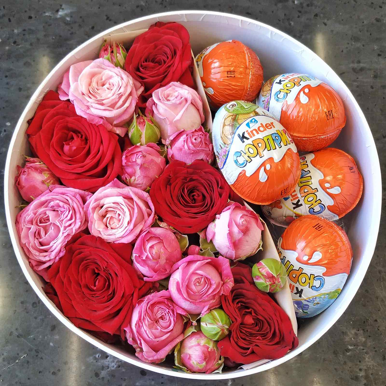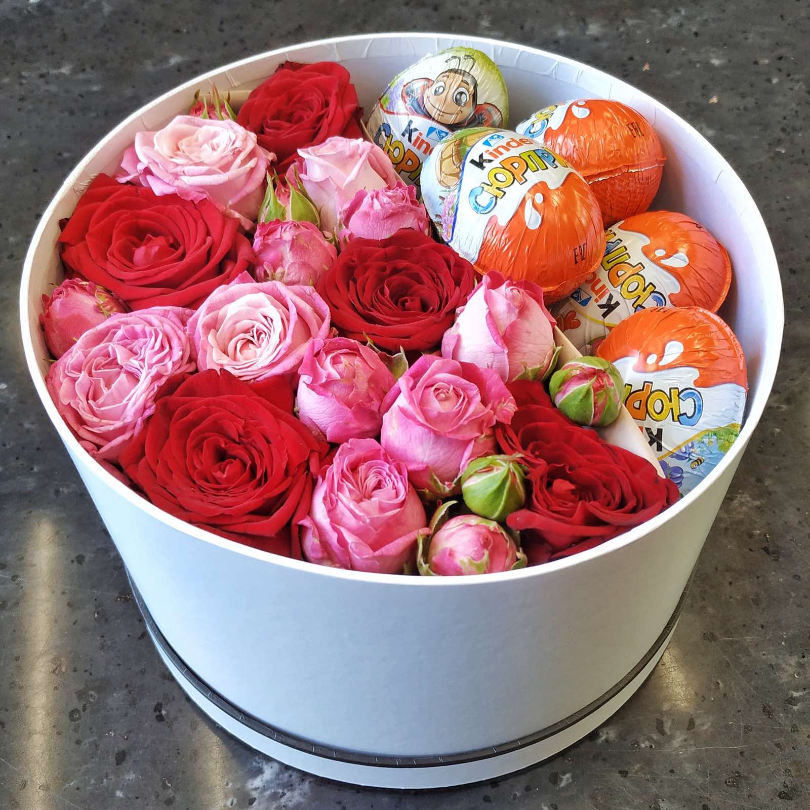 Композиция в шляпной коробке из 3 кустовых и 5 одиночных роз с киндер сюрпризами.