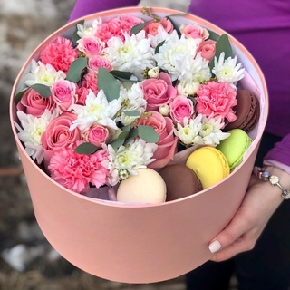 Шляпная коробка оформлена из одиночных и кустовых роз, гвоздик, хризантем, зелени и макарун.