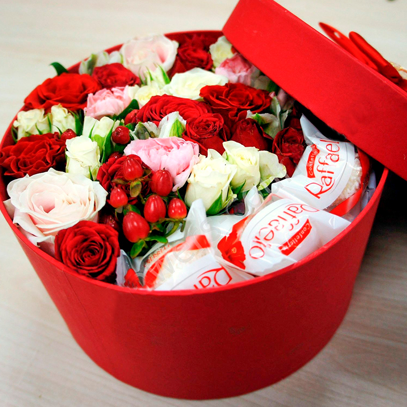 Состав композиции: красные белые и розовые розы (кустовые и одиночные), гиперикум, раффаэлло.