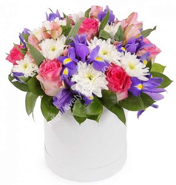 Состав: 4 веточки кустовой хризантемы, 7 розовых роз, 10 ирисов, 6 альстромерий и все это украшено зеленью.