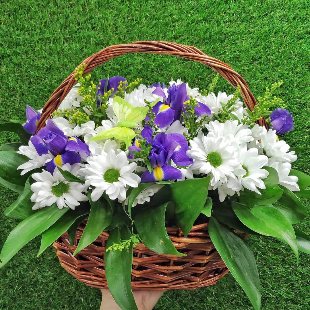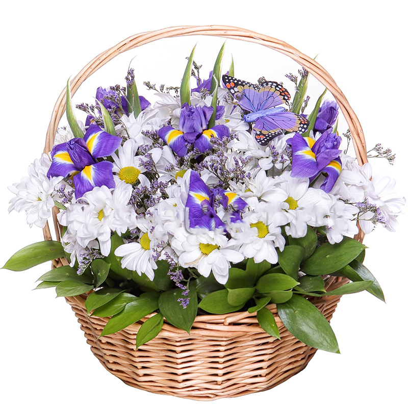 Состав: 7 ирисов, 5 веточек кустовой ромашковой хризантемы, статицы и зелени. Украшена бабочкой.