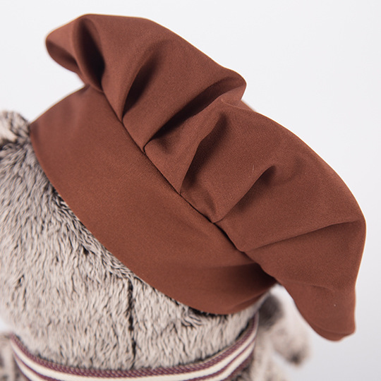 Басик-бариста в стильном фартуке из плотного хлопка в бело-коричневую полоску. На фартуке оригинальный принт с чашечкой кофе и кофейными зёрнами и надписью: «Басик любит кофе». На коте объёмный колпак из смесовой ткани кофейного цвета, а также галстук бабочка шоколадного цвета из шелковистого сатина.