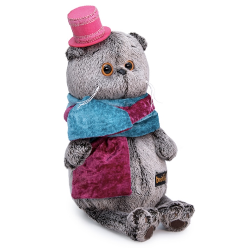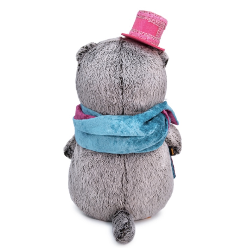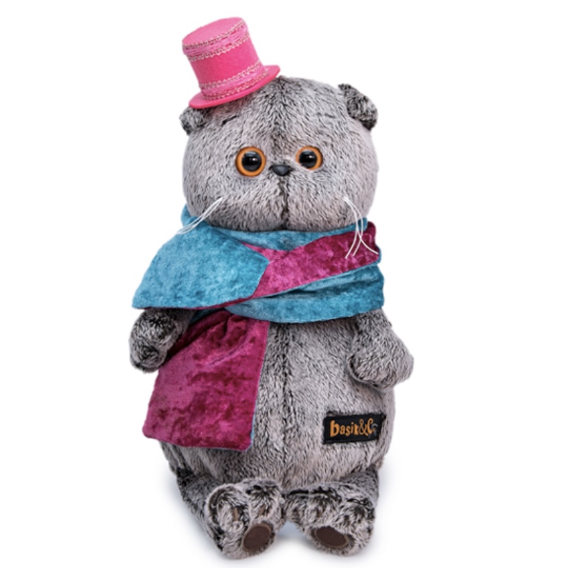 Кот в необычном комплекте, объёмном двустороннем шарфе из бархата и выполненной вручную шляпке-цилиндре из розового фетра с кружевом и металлизированной нитью.