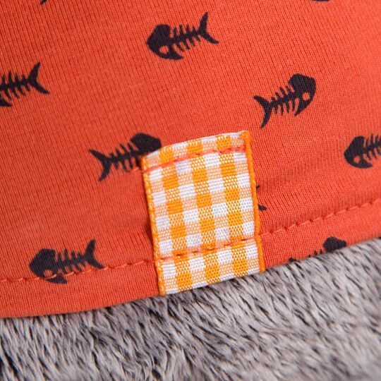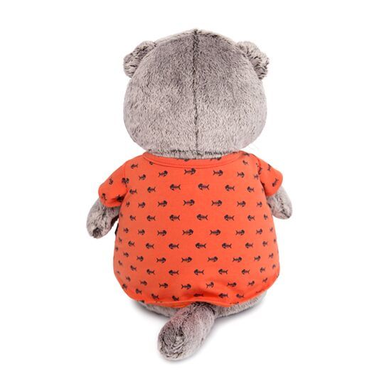 Все эти вопросы задавал любознательный Басик, разглядывая свою обновку. Оранжевый цвет — его любимый. И размер подходит. И против изображения львенка на месте кармашка Басик ничего не имеет против. Но почему от рыбок остались одни скелетики? Вот этого Басик никак понять не может. Вероятно, поэтому у него такой удивленный вид.