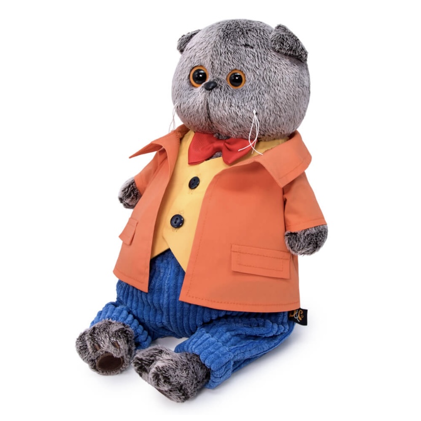 Оранжевый пиджак, сшитый из плотной костюмной ткани, желтый жилет на черный пуговках, ярко‑синие штаны из крупного вельвета. Завершает комплект алый галстук‑бабочка из сутажной ленты.