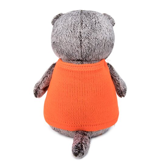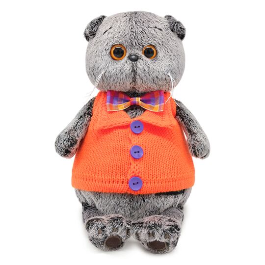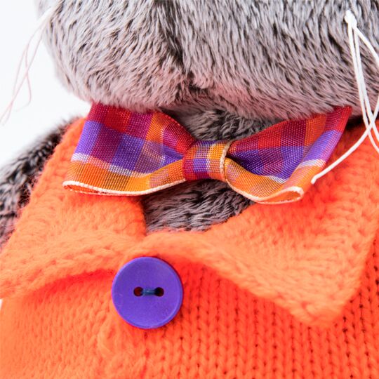 Басик в ярком, вязаном жилетике необыкновенного цвета. Такой модный в этом сезоне – неоновый оранжевый. Жилет с отворотами и фальшзастёжкой с пуговками контрастного сиреневого цвета. В комплекте галстук бабочка в оранжево-сиреневую клеточку.