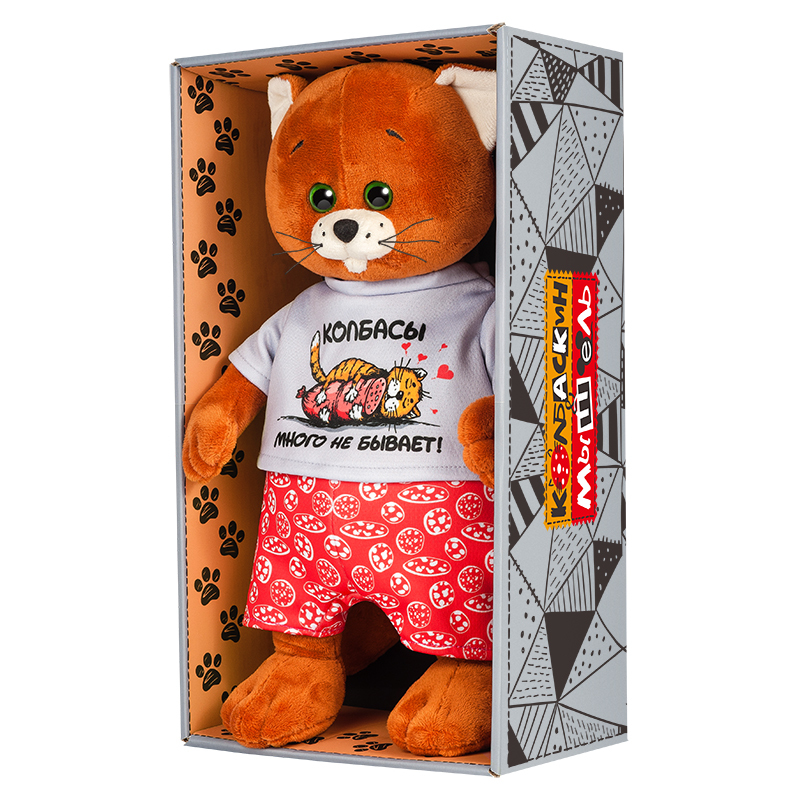 Колбаскин – продвинутый кот, который обожает поколбаситься, любит модную одежду с веселыми принтами и, конечно, колбасу! Сегодня выходной и он одет по-домашнему: красные труселя веселым принтом и, конечно же, футболка с надписью «Колбасы много не бывает»