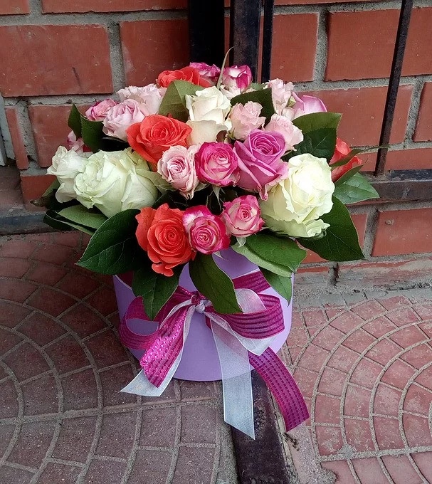 Микс роз в шляпной коробке